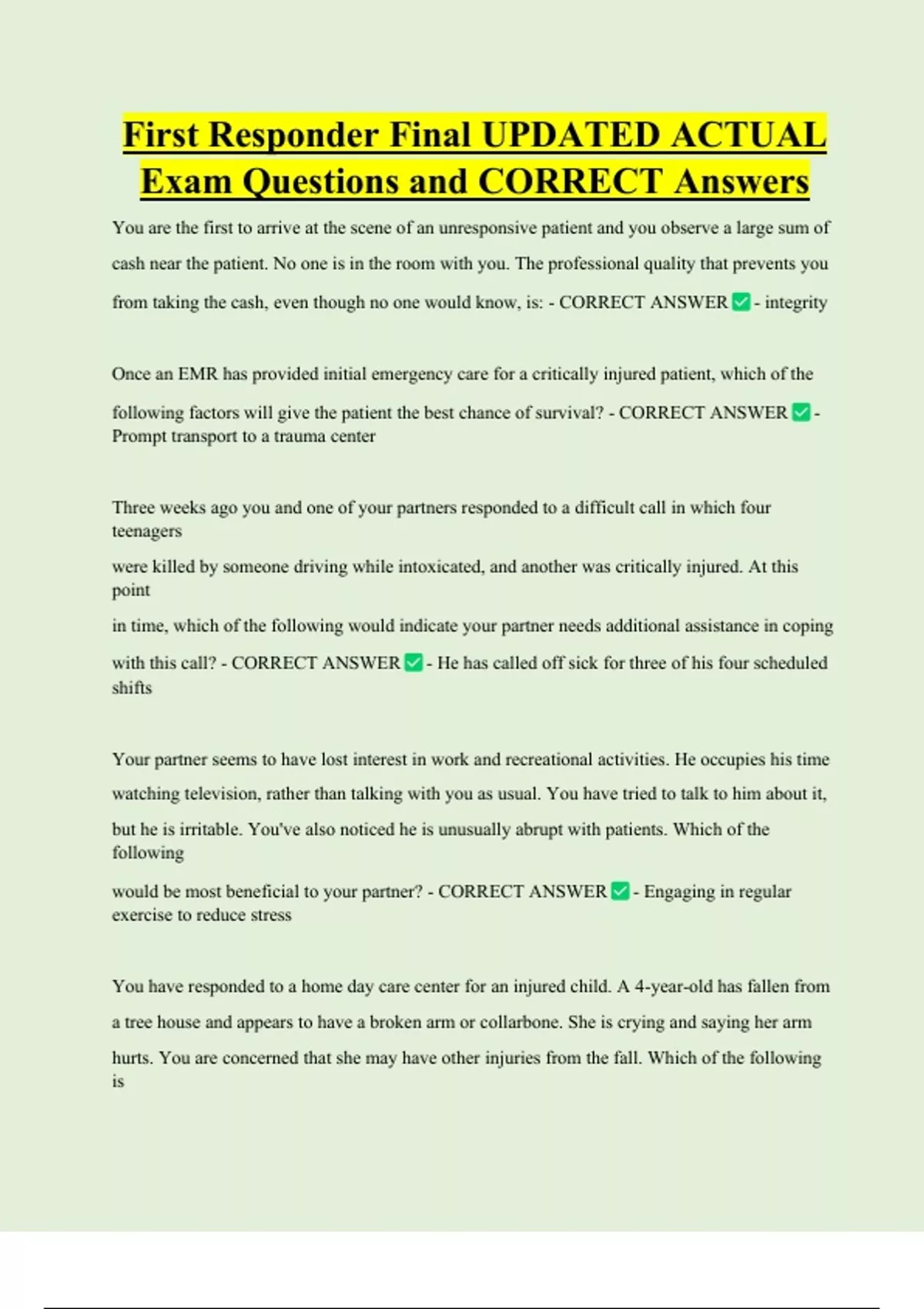 First Responder Final UPDATED ACTUAL Exam Questions and CORRECT Answers You are the first to arrive at the scene of an unresponsive patient and you observe a large sum of cash near the patient. No one is in the room with you. The professional quality that prevents you from taking the cash, even though no one would know, is: - CORRECT ANSWER - integrity Once an EMR has provided initial emergency care for a critically injured patient, which of the following factors will give the patient the best chance of survival? - CORRECT ANSWER Prompt transport to a trauma center Three weeks ago you and one of your partners responded to a difficult call in which four teenagers were killed by someone driving while intoxicated, and another was critically injured. At this point