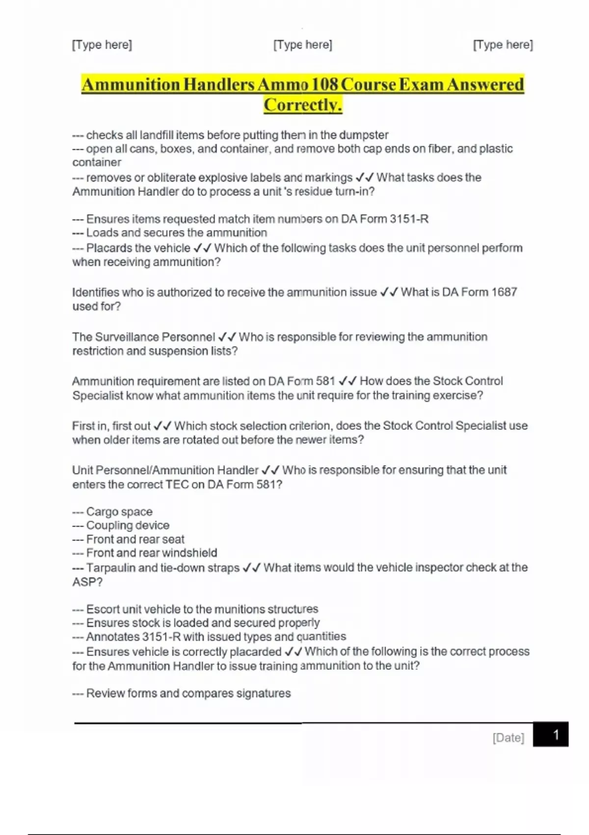 Ammunition Handlers Ammo 108 Course Exam Answered Correctly. Ammunition Handlers Ammo 108 Course Exam Answered Correctly.