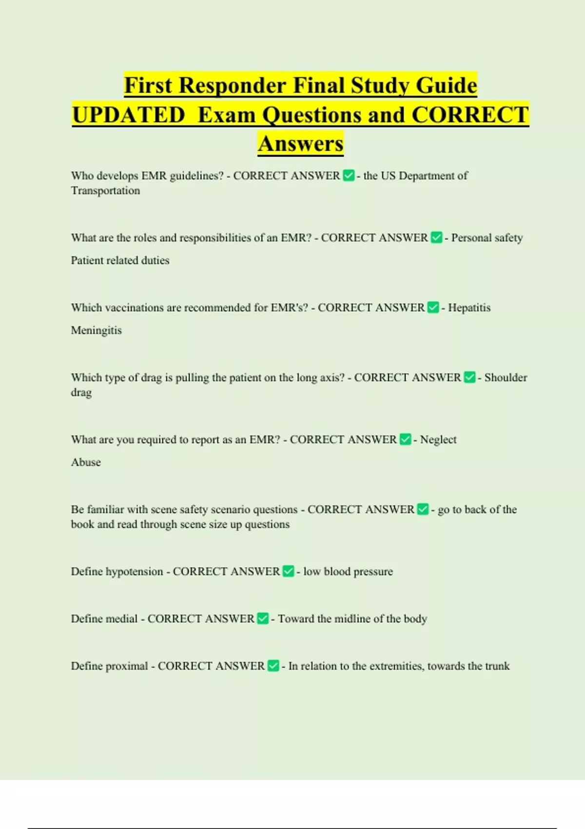 First Responder Final Study Guide UPDATED Exam Questions and CORRECT Answers Who develops EMR guidelines? - CORRECT ANSWER - the US Department of Transportation What are the roles and responsibilities of an EMR? - CORRECT ANSWER - Personal safety Patient related duties Which vaccinations are recommended for EMR's? - CORRECT ANSWER - Hepatitis Meningitis