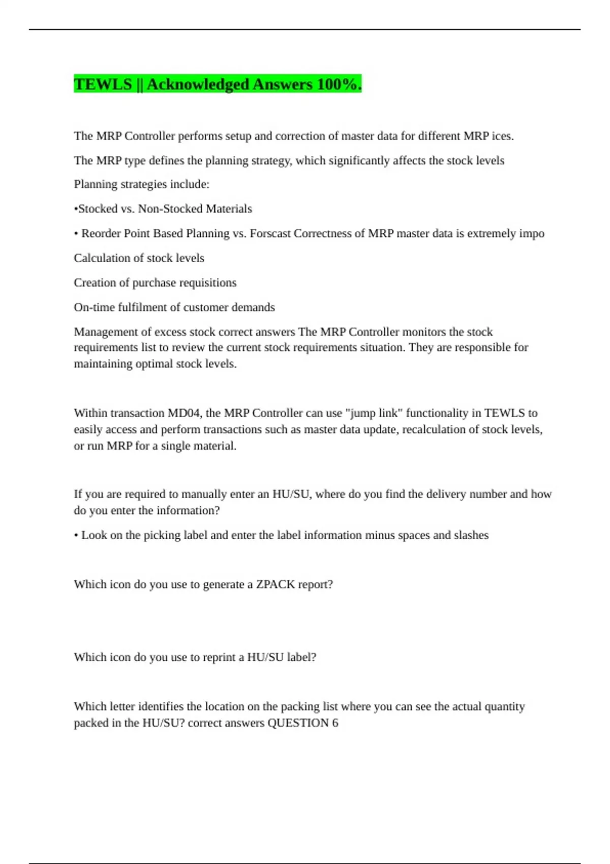Management of excess stock correct answers The MRP Controller monitors the stock