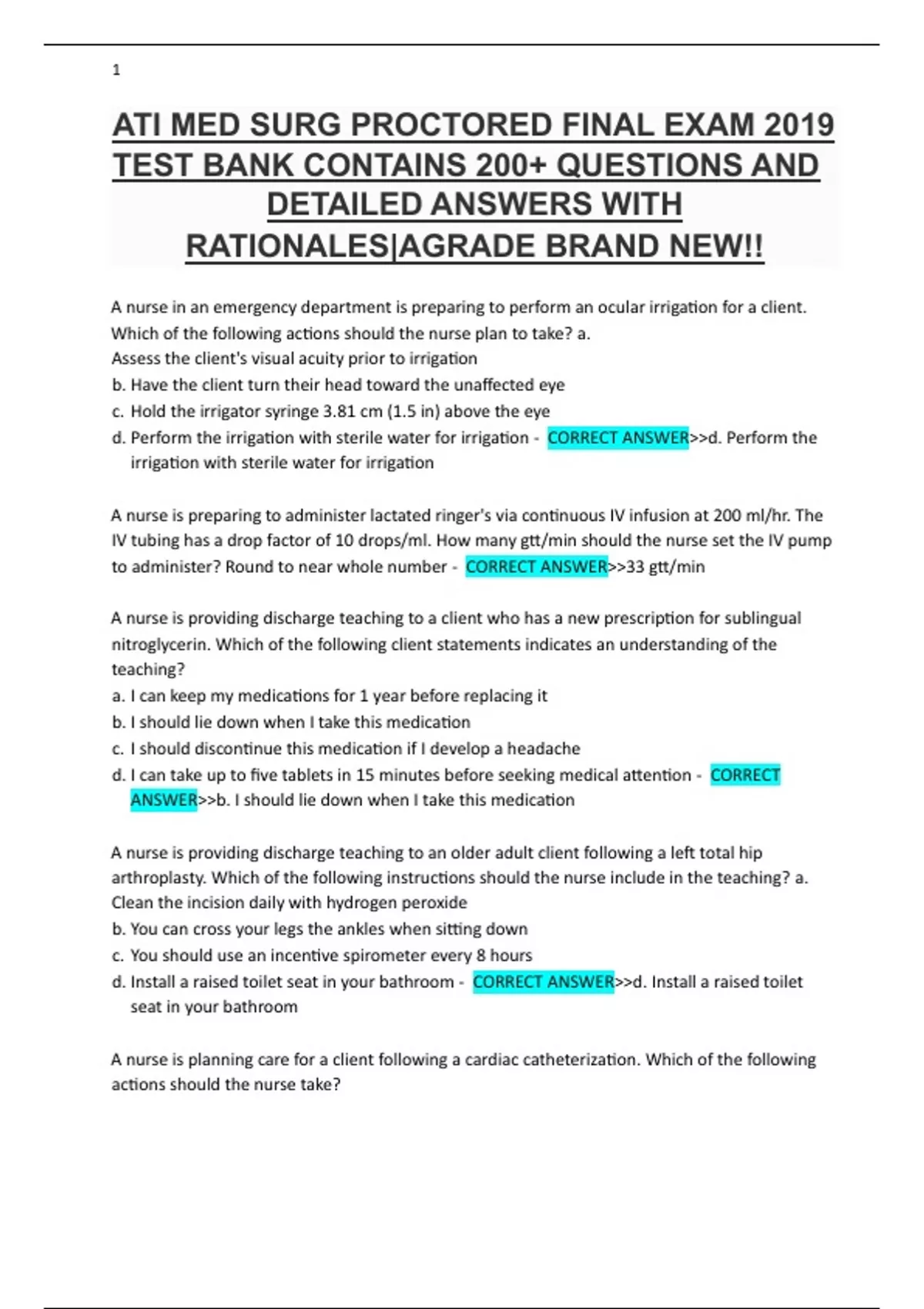 ATI MED SURG PROCTORED FINAL EXAM 2019 TEST BANK CONTAINS 200+ QUESTIONS AND DETAILED ANSWERS WITH RATIONALES|AGRADE BRAND NEW!!