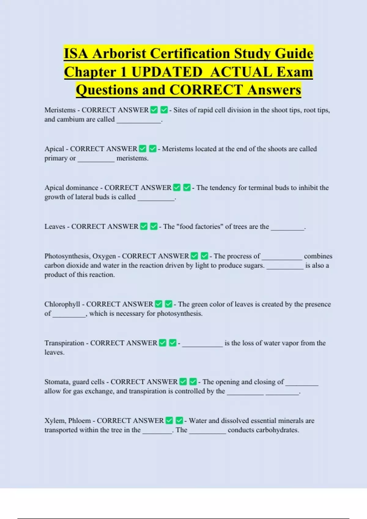 ISA Arborist Certification Study Guide Chapter 1 UPDATED ACTUAL Exam Questions and CORRECT Answers Meristems - CORRECT ANSWER and cambium are called ____________. Apical - CORRECT ANSWER - Sites of rapid cell division in the shoot tips, root tips, - Meristems located at the end of the shoots are called primary or __________ meristems. Apical dominance - CORRECT ANSWER growth of lateral buds is called _________