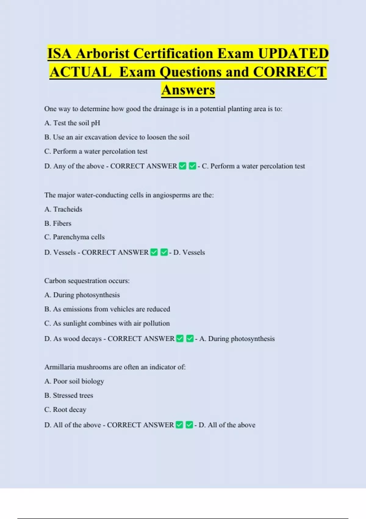 ISA Arborist Certification Exam UPDATED ACTUAL Exam Questions and CORRECT Answers One way to determine how good the drainage is in a potential planting area is to: A. Test the soil pH B. Use an air excavation device to loosen the soil C. Perform a water percolation test D. Any of the above - CORRECT ANSWER - C. Perform a water percolation test The major water-conducting cells in angiosperms are the