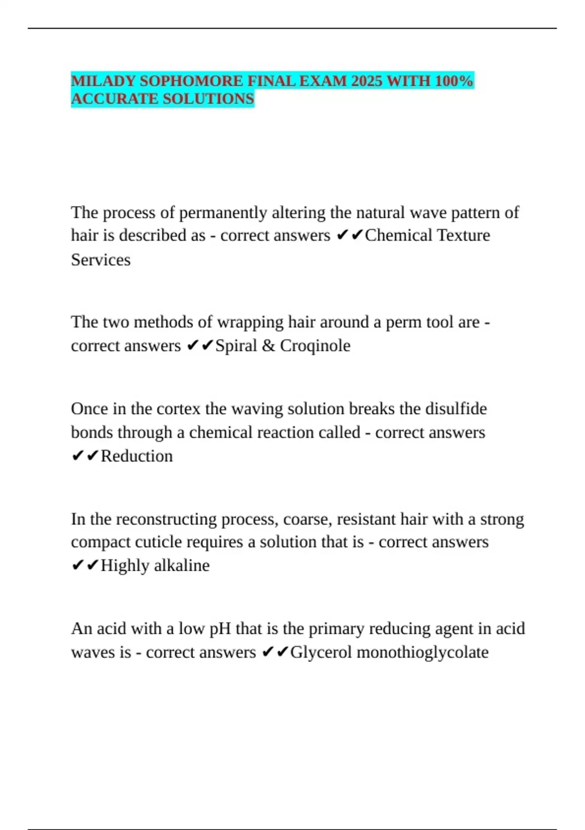 The process of permanently altering the natural wave pattern of hair is described as - correct answers Chemical Texture Services The two methods of wrapping hair around a perm tool are - correct answers Spiral & Croqinole Once in the cortex the waving solution breaks the disulfide bonds through a chemical reaction called - correct answers Reduction In