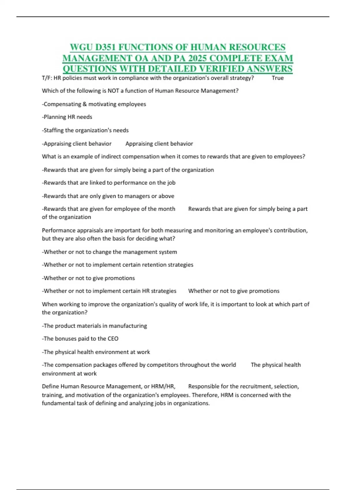 WGU D351 FUNCTIONS OF HUMAN RESOURCES