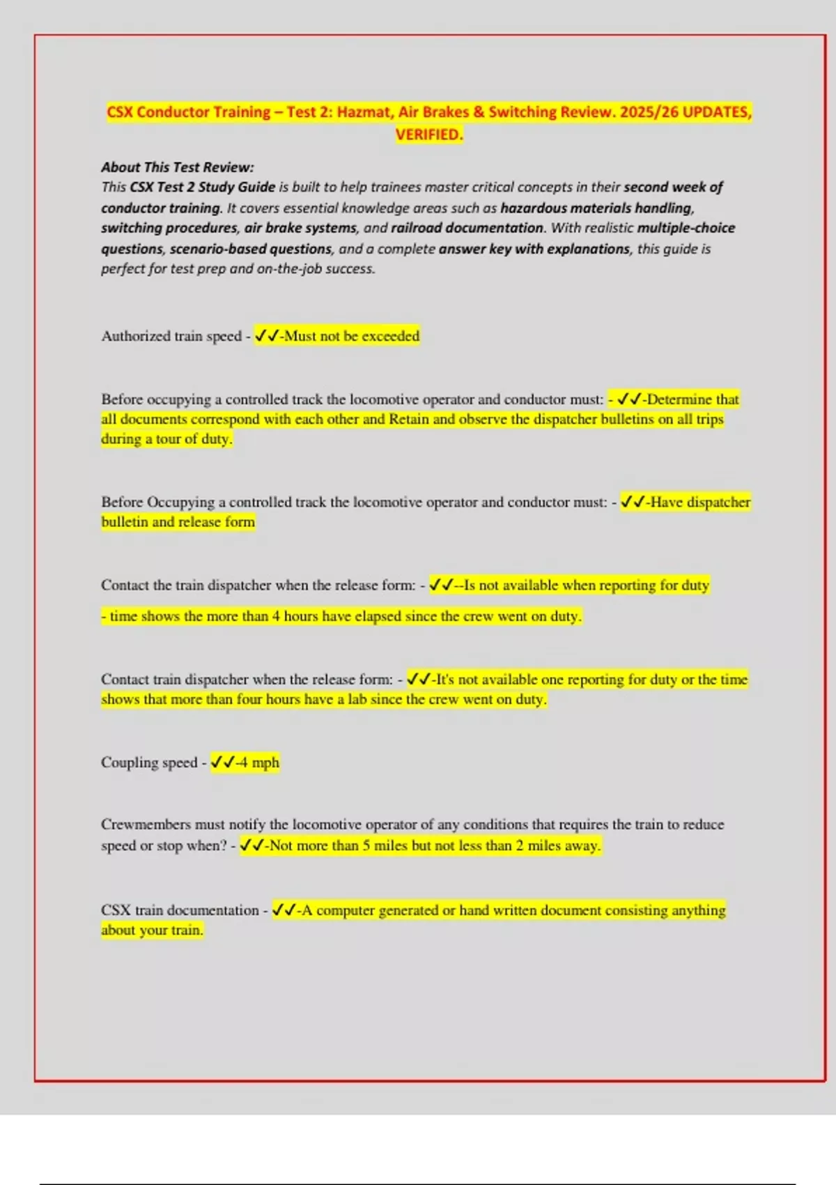 CSX Conductor Training – Test 2: Hazmat, Air Brakes & Switching Review. 2025/26 UPDATES, VERIFIED. About This Test Review: This CSX Test 2 Study Guide is built to help trainees master critical concepts in their second week of conductor training. It covers essential knowledge areas such as hazardous materials handling, switching procedures, air brake systems, and railroad documentation. With realistic multiple-choice questions, scenario-based questions, and a complete answer key with explanations, this guide is perfect for test prep and on-the-job success. Authorized train speed - -Must not be exceeded Before occupying a controlled track the locomotive operator and conductor must: - -Determine that all documents correspond with each other and Retain and observe the dispatcher bulletins on all trips during a tour of duty. Before Occupying a controlled track the locomotive operator and conductor must: - -Have dispatcher bulletin and release form Contact the train dispatcher when the release form: - --Is not available when reporting for duty - time shows the more than 4 hours have elapsed since the crew went on duty. Contact train dispatcher when the release form: - -It's not available one reporting for duty or the time shows that more than four hours have a lab since the crew went on duty. Coupling speed - -4 mph Crewmembers must notify the locomotive operator of any conditions that requires the train to reduce speed or stop when? - -Not more than 5 miles but not less than 2 miles away. CSX train documentation - -A computer generated or hand written document consisting anything about your train. CSXT Train Documentation - -What must freight train crews have before their train departs its originating point? Dispatcher Bulletin - -Information relating to the most recently issued system and division bulletins. Dispatcher message or EC-1 specifies: - -Temporary track speed Division Bulletin - -Written or electronically transmitted special instructions issued by a decision concerning the safety of employees in the movement of trains.