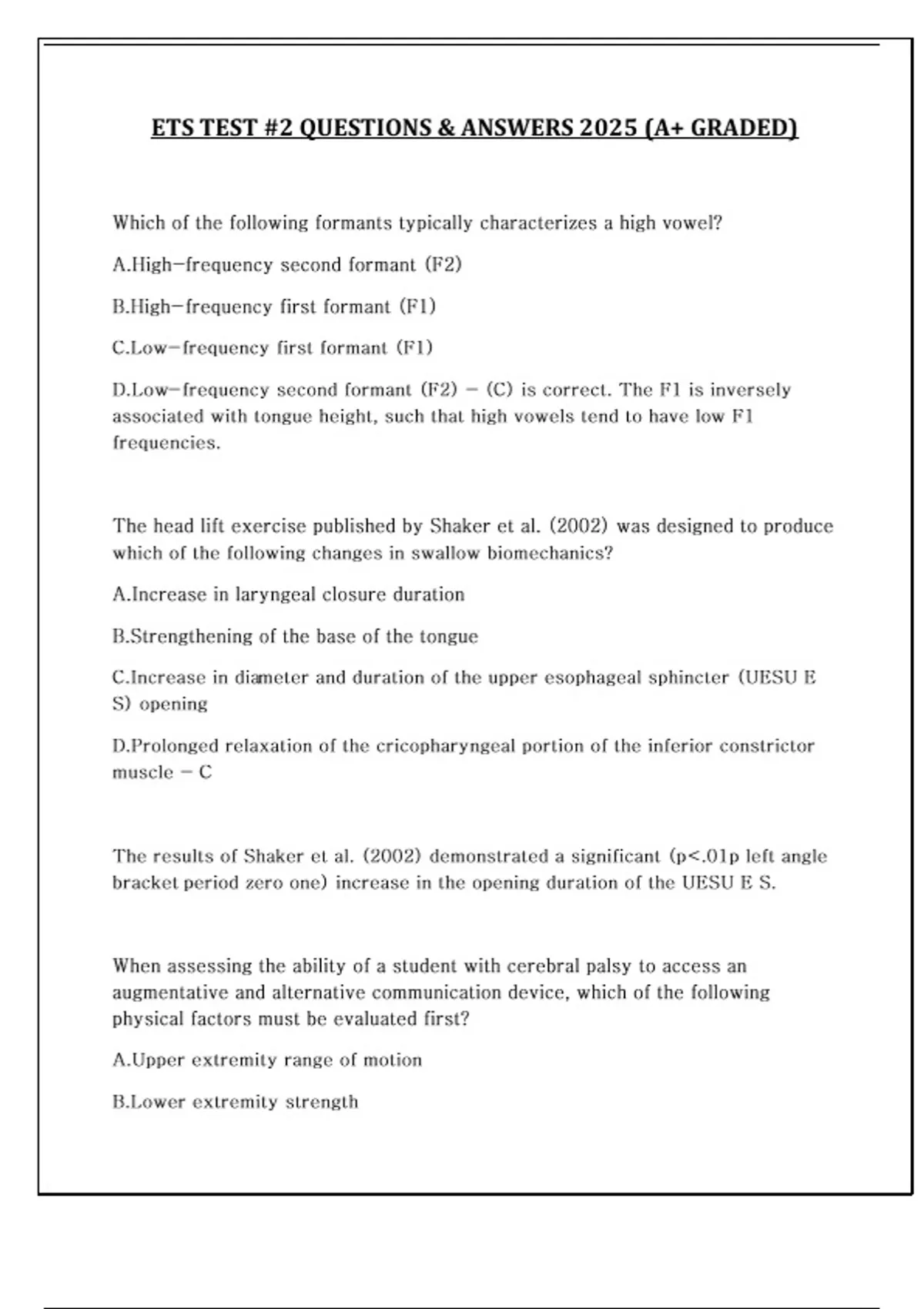 ETS TEST #2 QUESTIONS & ANSWERS 2025 (A+ GRADED) Which of the following formants typically characterizes a high vowel? A.High-frequency second formant (F2) B.High-frequency first formant (F1) C.Low-frequency first formant (F1) D.Low-frequency second formant (F2) - (C) is correct. The F1 is inversely associated with tongue height, such that high vowels tend to have low F1 frequencies. The head lift exercise published by Shaker et al. (2002) was designed to produce which of the following changes in swallow biomechanics? A.Increase in laryngeal closure duration B.Strengthening of the base of the tongue C.Increase in diameter and duration of the upper esophageal sphincter (UESU E S) opening D.Prolonged relaxation of the cricopharyngeal portion of the inferior constrictor muscle - C The results of Shaker et al. (2002) demonstrated a significant (p<.01p left angle bracket period zero one) increase in the opening duration of the UESU E S. When assessing the ability of a student with cerebral palsy to access an augmentative and alternative communication device, which of the following physical factors must be evaluated first? A.Upper extremity range of motion B.Lower extremity strength C.Trunk stability and control D.Fine motor dexterity - (C) is correct. Trunk stability will guide the clinician in making an appropriate recommendation for the type of device a client can access as it influences more distal movements. An 81-year-old female presents to a rehabilitation hospital following a severe L MCA stroke. The patient has poststroke right-sided weakness, right neglect, and suspected nonfluent aphasia. Receptive language appears to be mildly impacted. The patient has a complex medical history, including TBI following a car accident two years ago, obesity, diabetes, seizure disorder, congestive heart failure, and hypertension. Socially, the patient has lived alone for the past three years following her husband's death. Since her car accident she mainly watches TV at home and leaves her house only for dialysis. She has meals on wheels and home health aides to assist her with showering. Because of her TBI, her behavior is often variable and erratic. The highest level of education she attained was seventh grade. She stayed home to take care of her children and did not have a career. Continues...