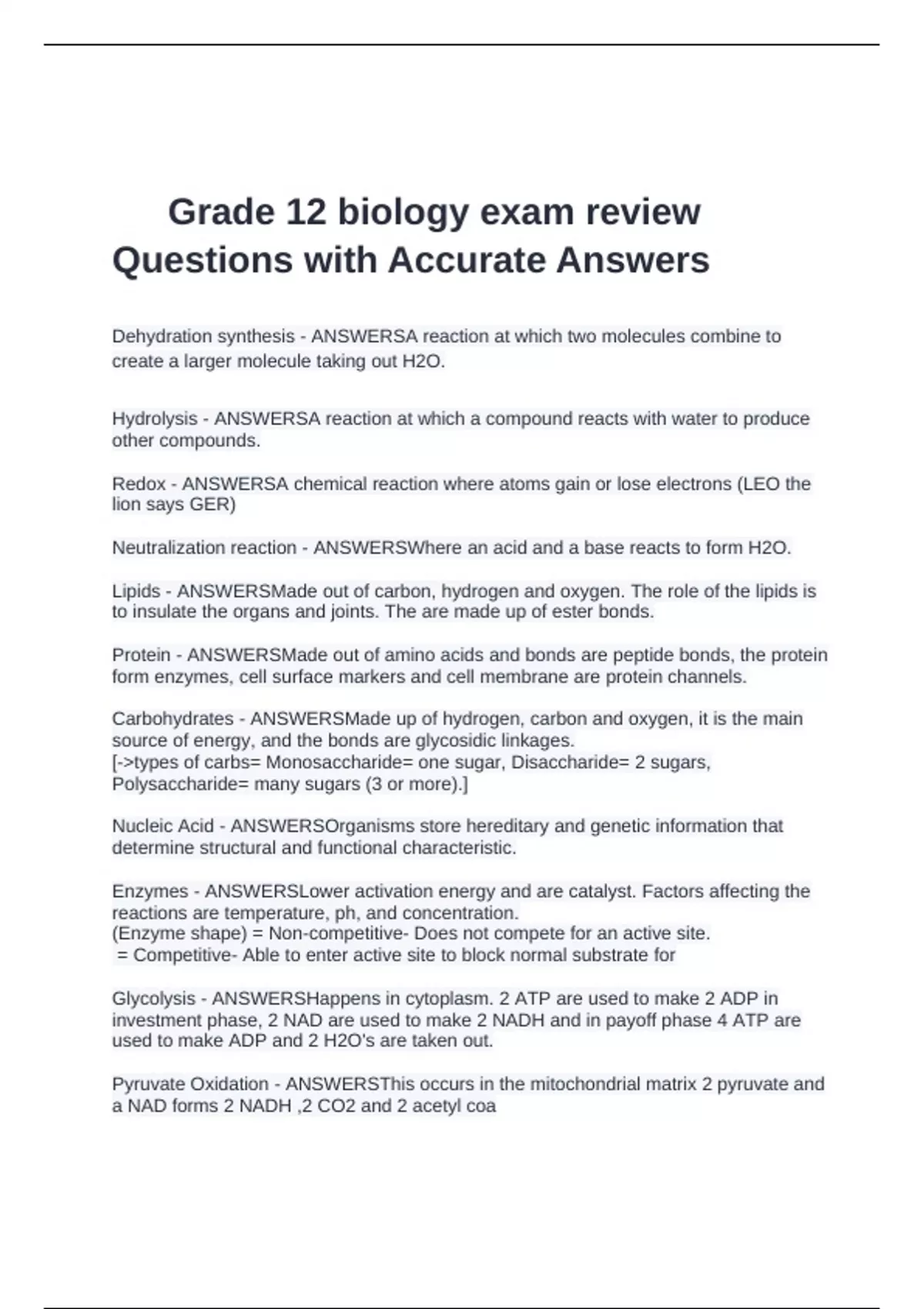 Grade 12 biology exam review Questions with Accurate Answers