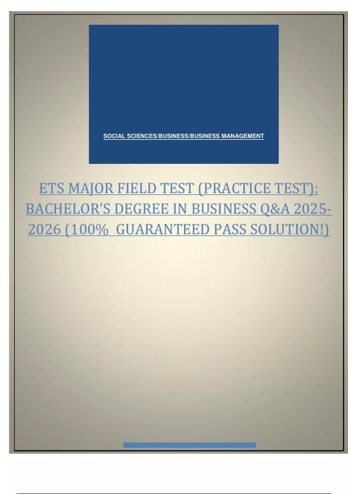 ETS MAJOR FIELD TEST (PRACTICE TEST): BACHELOR'S DEGREE IN BUSINESS Q&A (100% GUARANTEED PASS SOLUTION!) The common characteristic possessed by all assets is a) Long life b) Great monetary value c) Tangible nature d) Future economic benefit - ANS-d) Future economic benefit Which Foreign Direct Investment (FDI) attempts to acquire particular resources at a lower real cost than could be obtained in the home country? a) Market-seeking FDI b) Efficiency-seeking FDI c) Resource-seeking FDI d) Strategic asset-seeking FDI - ANS-c) Resource-seeking FDI Under the Uniform Commercial Code (UCC) statute of frauds, which of the following terms must be included in writing in order to satisfy the writing requirement? a) The price of the goods. b) The quantity of the goods. c) The signatures and names of the buyer and the seller d) The time and place for delivery - ANS-b) The quantity of the goods Which of the following is an appropriate Federal Reserve action to stimulate the United States economy? a) Selling government bonds on the open market b) Increasing the discount rate c) Reducing the reserve requirement d) Cutting taxes - ANS-c) Reducing the reserve requirement Which of the following is true with regard to an exculpatory clause? a) An exculpatory clause excuses one party from liability for his/her own tortious conduct. b) Where one party has a superior bargaining position that has enabled him/her to impose an exculpatory clause upon the other, the courts are inclined to nullify the provision. c) An exculpatory clause may be unenforceable for unconscionability. d) All of the above are true - ANS-d) All of the above are true Managers at ABC, Inc. analyze the current situation of their organization and then develop plans to help their organization to accomplish its mission and achieve its goals. This is known as: Continues....