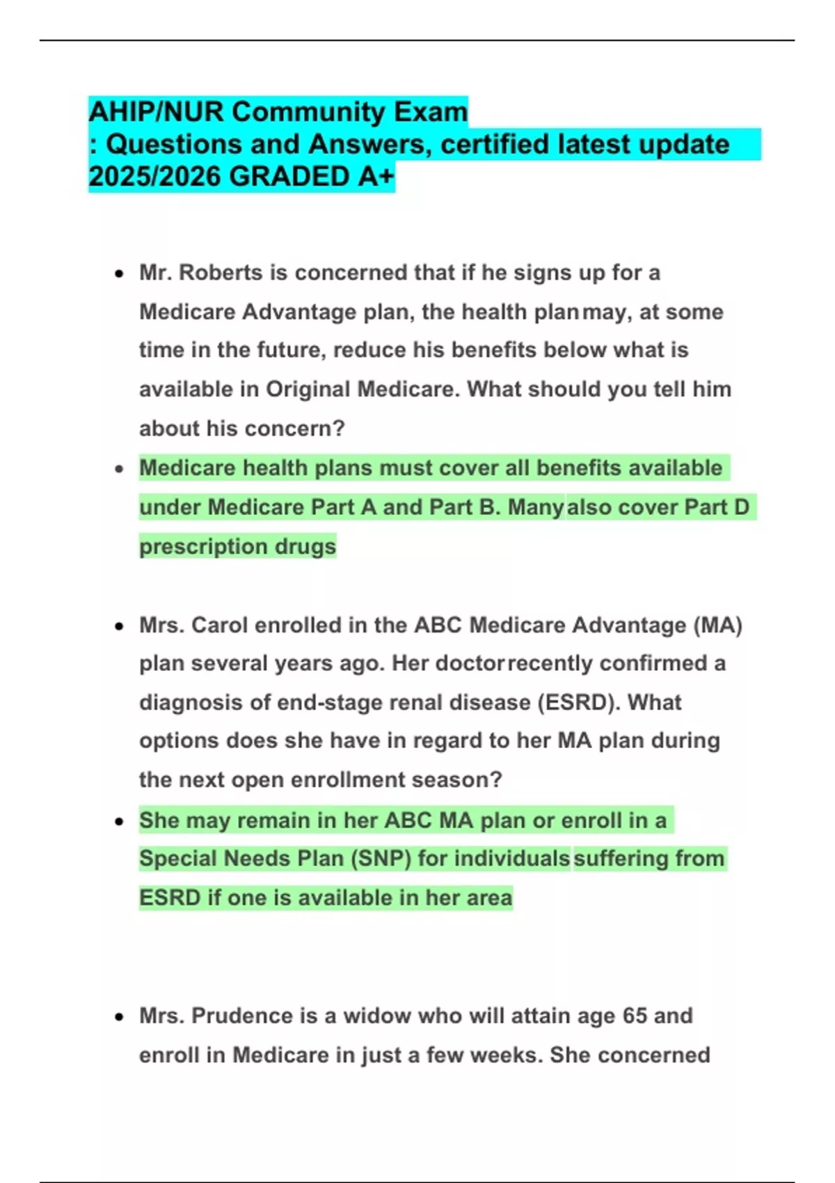 This document includes the latest certified AHIP/NUR Community exam questions and accurate answers, fully updated for the 2025/2026 cycle. It covers key areas such as Medicare Advantage, Part D, fraud prevention, compliance regulations, and healthcare plan eligibility. Graded A+, this resource is ideal for nursing and healthcare professionals preparing for AHIP certification with guaranteed accuracy.