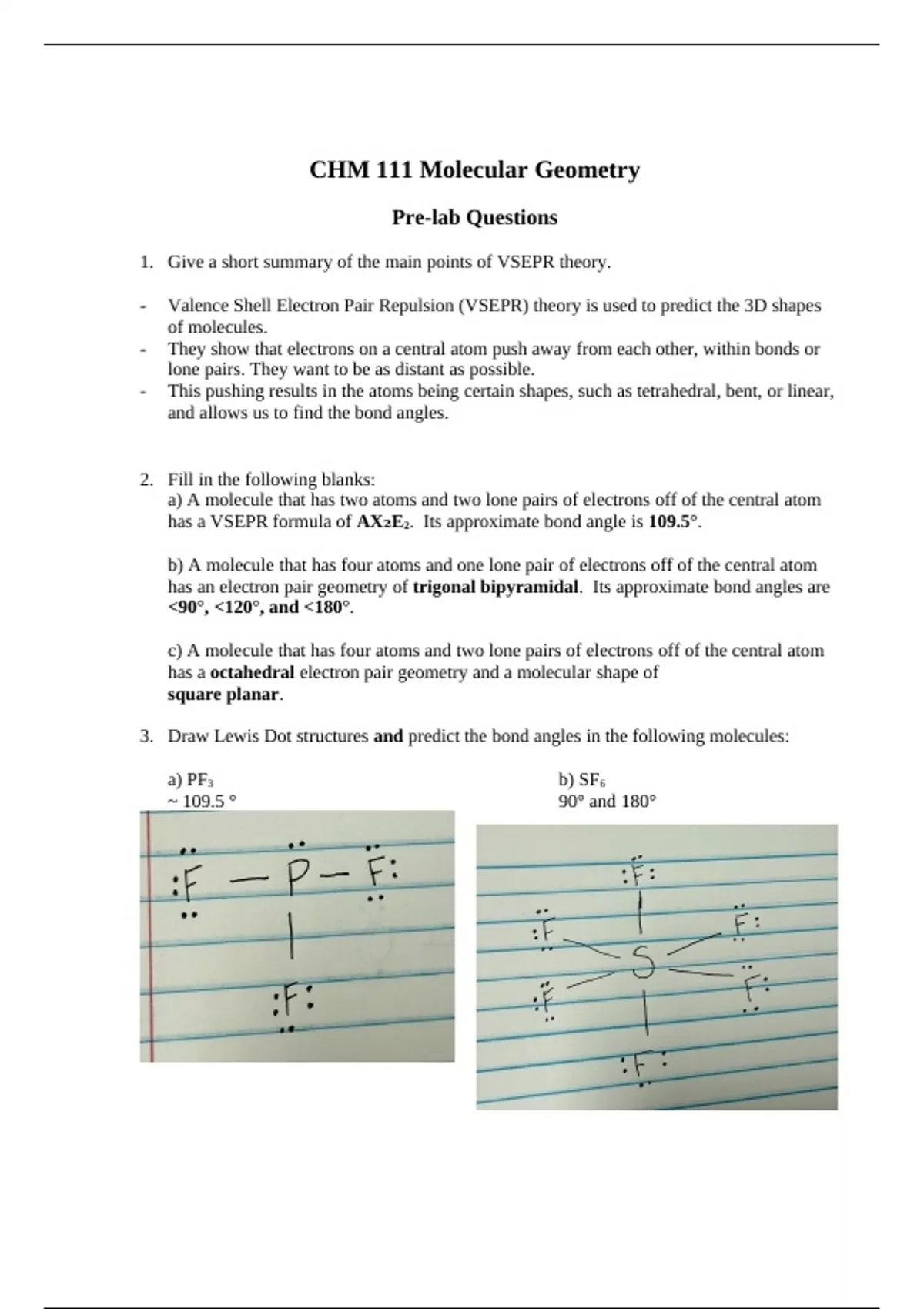 Chemisrty 111 pre-lab questions for Molecular geometry