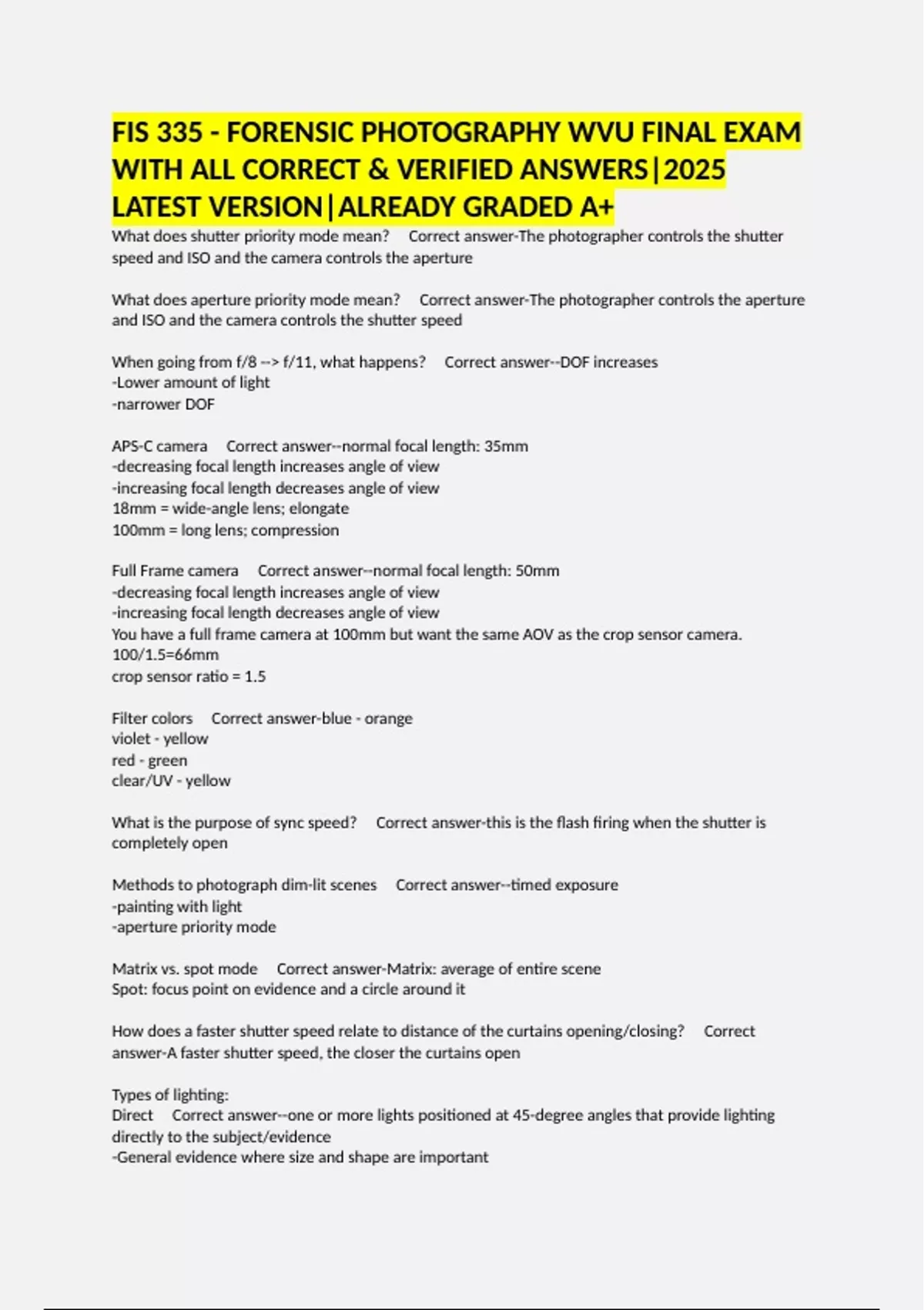 FIS 335 - FORENSIC PHOTOGRAPHY WVU FINAL EXAM WITH ALL CORRECT & VERIFIED ANSWERS|2025 LATEST VERSION|ALREADY GRADED A+