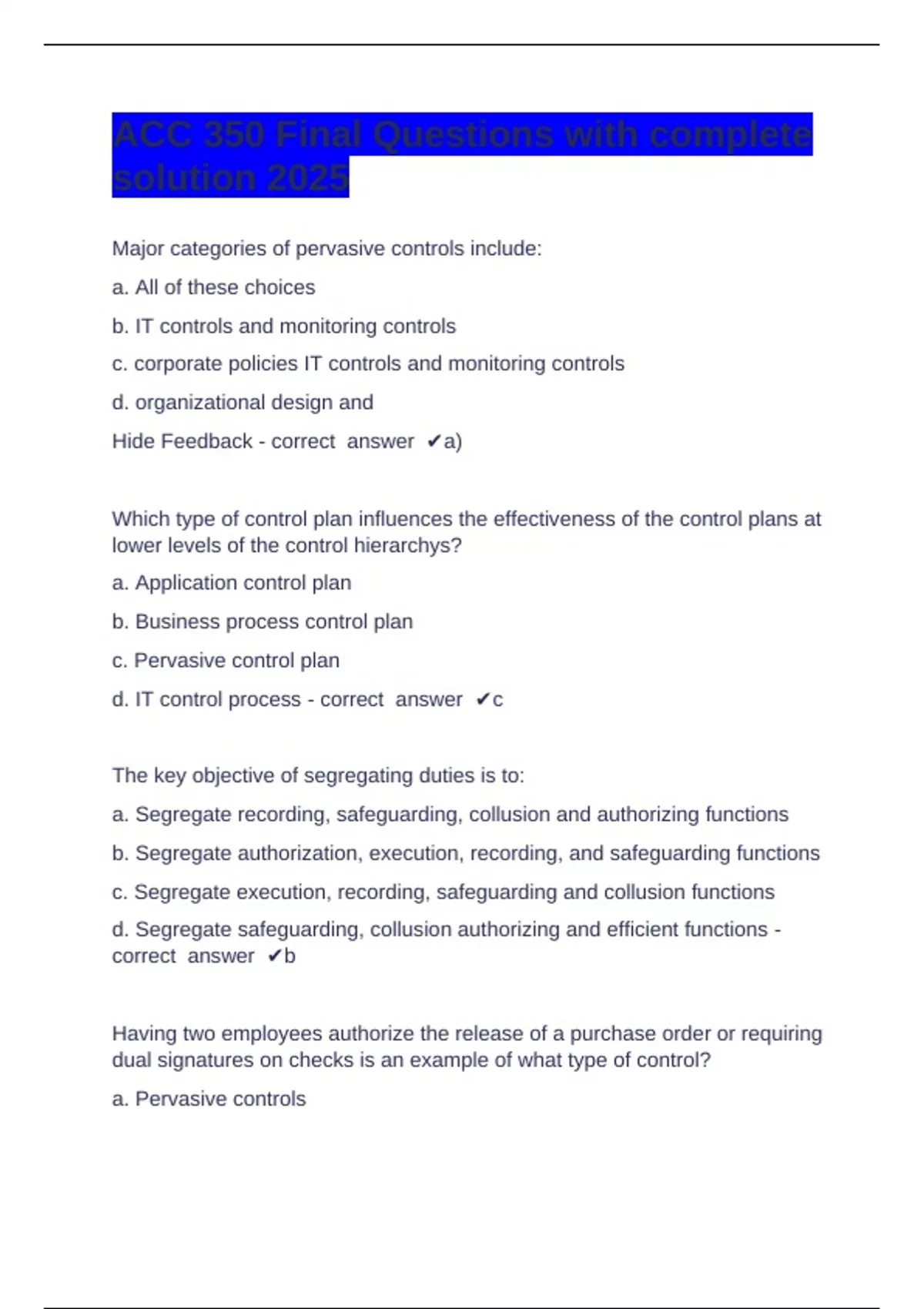 ACC 350 Final Questions with complete solution 2025 Major categories of pervasive controls include: a. All of these choices b. IT controls and monitoring controls c. corporate policies IT controls and monitoring controls d. organizational design and Hide Feedback - correct answer a) Which type of control plan influences the effectiveness of the control plans at lower levels of the control hierarchys? a. Application control plan b. Business process control plan c. Pervasive control plan d. IT control process - correct answer c The key objective of segregating duties is to: a. Segregate recording, safeguarding, collusion and authorizing functions b. Segregate authorization, execution, recording, and safeguarding functions c. Segregate execution, recording, safeguarding and collusion functions d. Segregate safeguarding, collusion authorizing and efficient functions - correct answer b Having two employees authorize the release of a purchase order or requiring dual signatures on checks is an example of what type of control? a. Pervasive contro