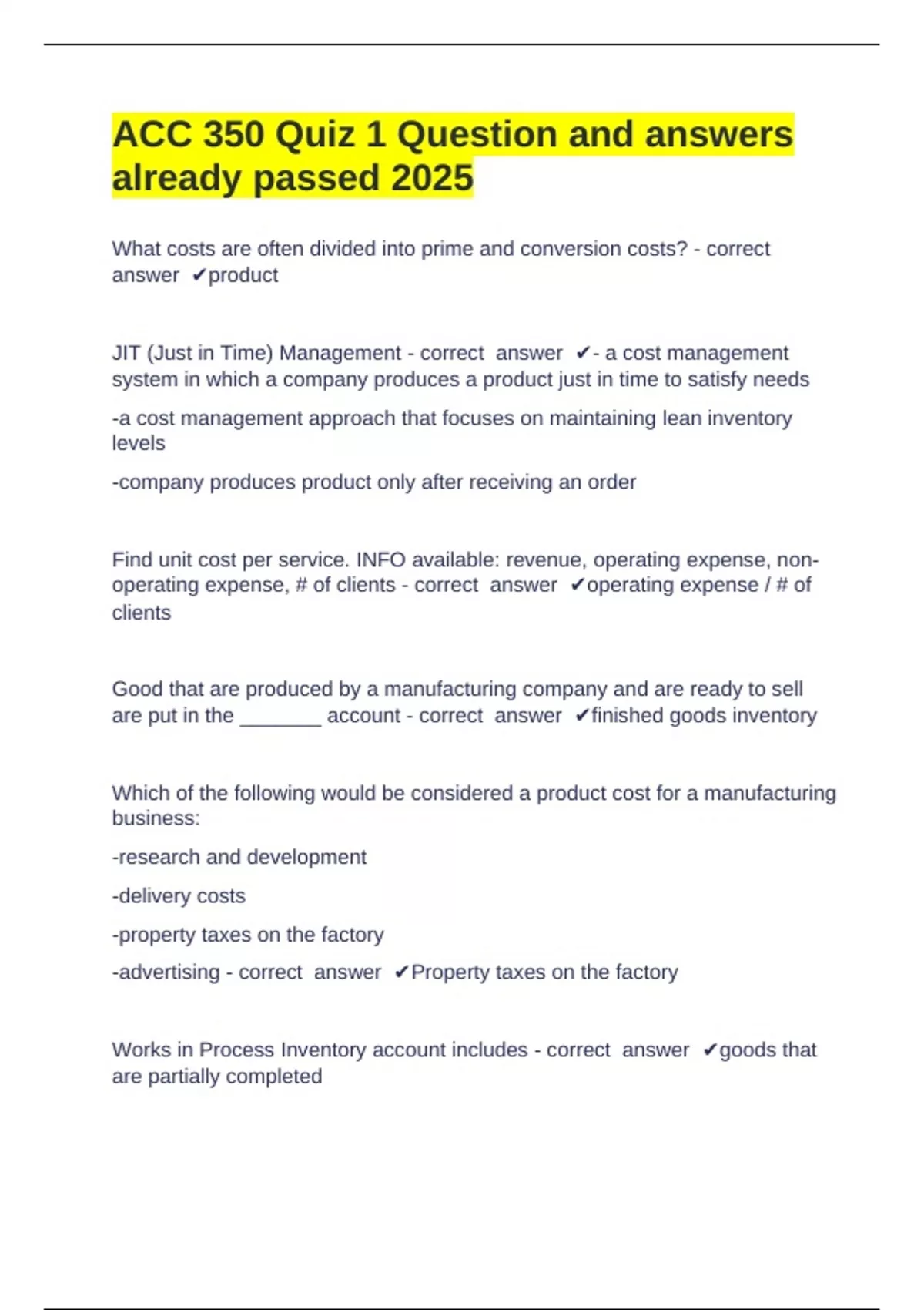 ACC 350 Quiz 1 Question and answers already passed 2025 What costs are often divided into prime and conversion costs? - correct answer product JIT (Just in Time) Management - correct answer - a cost management system in which a company produces a product just in time to satisfy needs -a cost management approach that focuses on maintaining lean inventory levels -company produces product only after receiving an order Find unit cost per service. INFO available: revenue, operating expense, non-operating expense, # of clients - correct answer operating expense / # of clients Good that are produced by a manufacturing company and are ready to sell are put in the _______ account - correct answer finished goods inventory Which of the following would be considered a product cost for a manufacturing business: -research and development -delivery costs -property taxes on the factory -advertising - correct answer Property taxes on the factory Works in Process Inventory account includes - correct answer goods that are partially complet