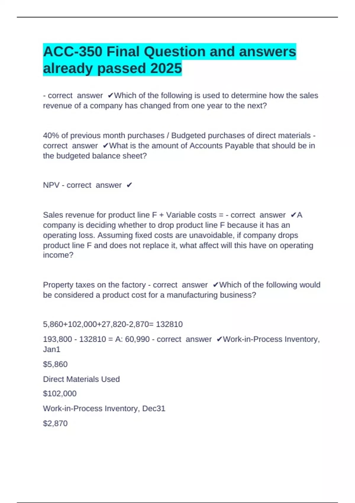ACC-350 Final Question and answers already passed 2025 - correct answer Which of the following is used to determine how the sales revenue of a company has changed from one year to the next? 40% of previous month purchases / Budgeted purchases of direct materials - correct answer What is the amount of Accounts Payable that should be in the budgeted balance sheet? NPV - correct answer Sales revenue for product line F + Variable costs = - correct answer A company is deciding whether to drop product line F because it has an operating loss. Assuming fixed costs are unavoidable, if company drops product line F and does not replace it, what affect will this have on operating income? Property taxes on the factory - correct answer Which of the following would be considered a product cost for a manufacturing business? 5,860+102,000+27,820-2,870= 132810 193, = A: 60,990 - correct answer Work-in-Process Inventory, Jan1 $5,860 Direct Materials Used $102,000 Work-in-Process Inventory, Dec31