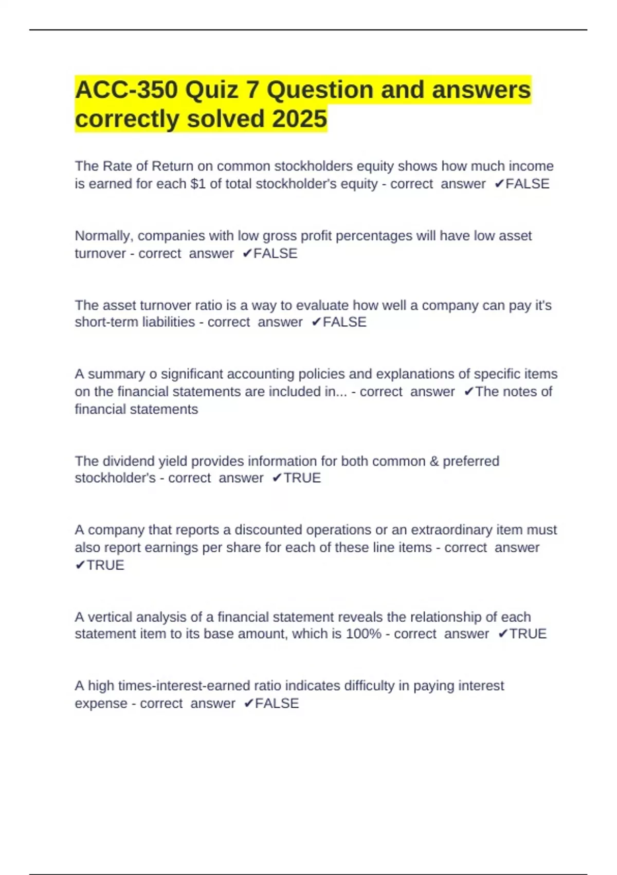 is earned for each $1 of total stockholder's equity - correct answer ✔FALSE