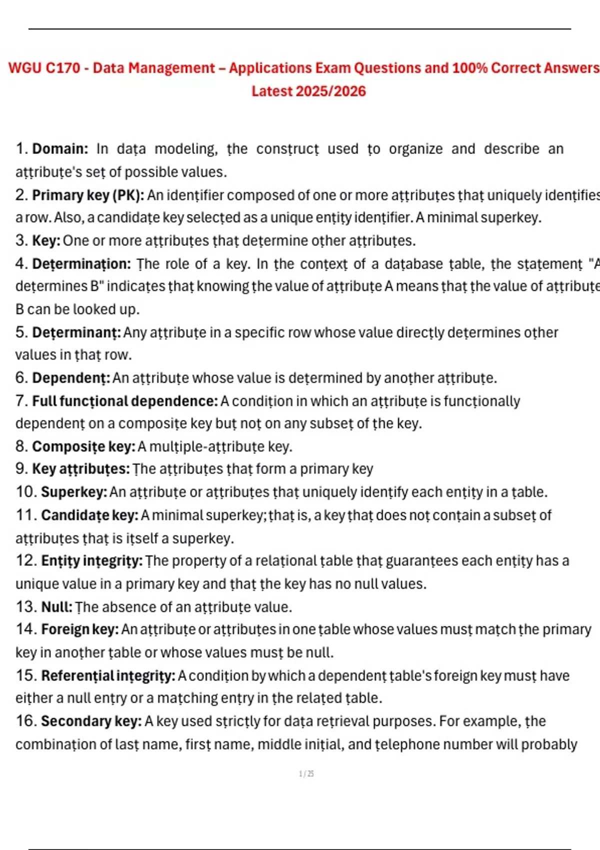 This document includes a complete set of exam questions with 100% correct answers for the WGU C170: Data Management – Applications course, fully updated for the 2025/2026 academic year. It covers key topics such as SQL syntax, database normalization, ER modeling, relational schema design, and data manipulation commands. Ideal for students preparing for the applications exam, this guide ensures accurate understanding and confident performance.