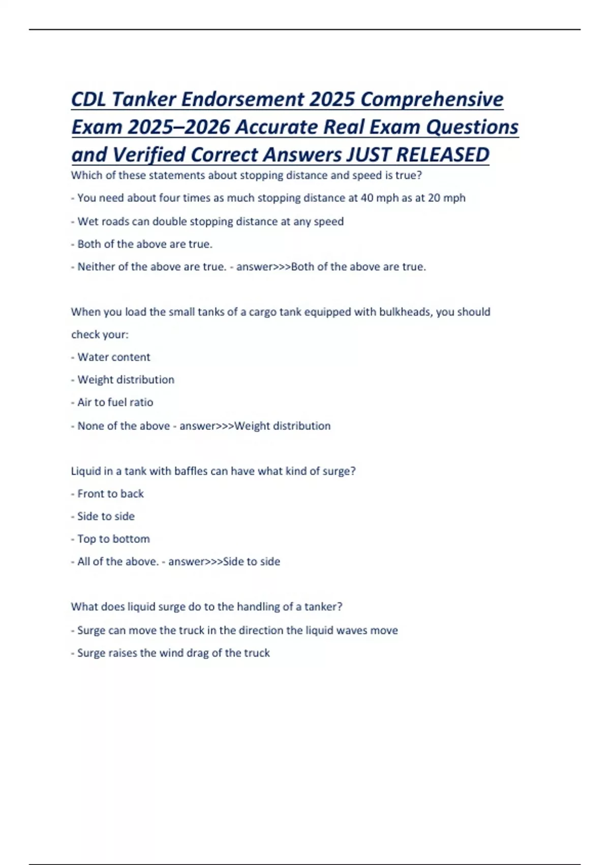 This document provides the complete and verified set of real exam questions with correct answers for the CDL Tanker Endorsement Comprehensive Exam for the 2025–2026 cycle. It covers critical topics such as liquid surge control, vehicle inspection, safe driving practices, cargo securement, and federal regulations for transporting liquids and gases in tank vehicles. Perfect for commercial drivers preparing to earn or renew their tanker endorsement.