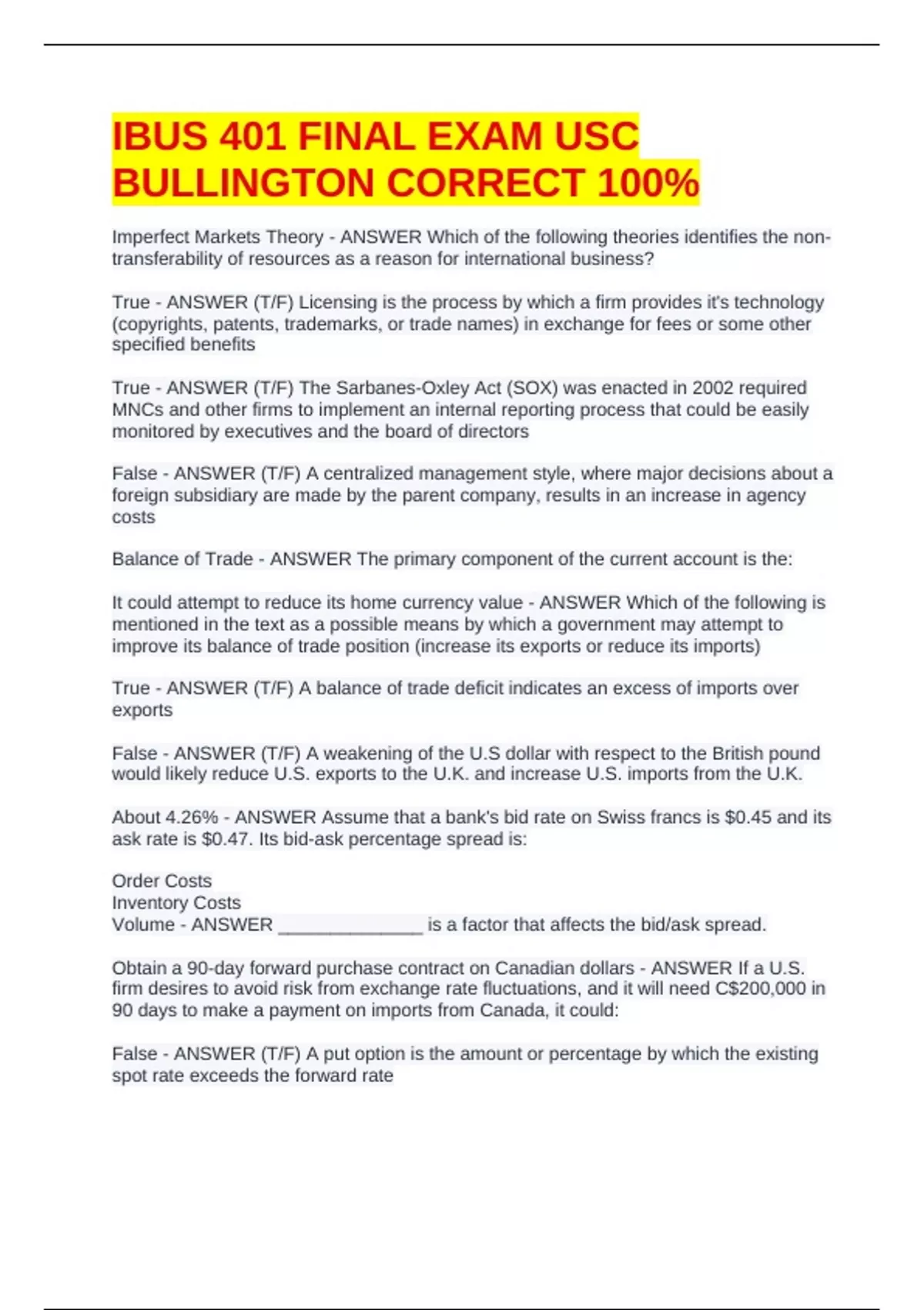 IBUS 401 FINAL EXAM USC BULLINGTON CORRECT 100%