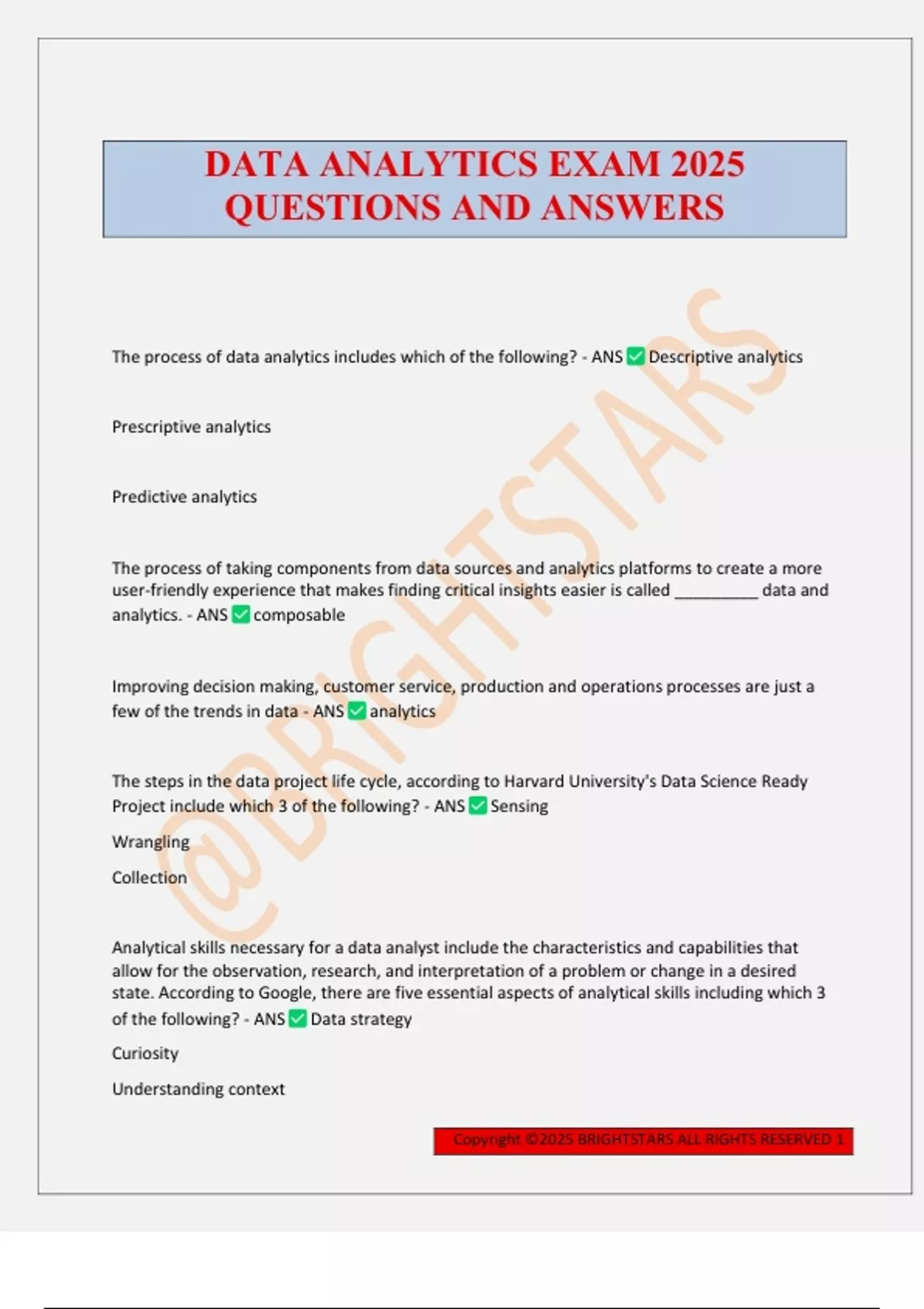 The process of data analytics includes which of the following? - ANS Descriptive analytics Prescriptive analytics Predictive analytics The process of taking components from data sources and analytics platforms to create a more user-friendly experience that makes finding critical insights easier is called _________ data and analytics. - ANS composable Improving decision making, customer service, production and operations processes are just a few of the trends in data - ANS analytics The steps in the data project life cycle, according to Harvard University's Data Science Ready Project include which 3 of the following? - ANS Sensing Wrangling Collection Analytical skills necessary for a data analyst include the characteristics and capabilities that allow for the observation, research, and interpretation of a problem or change in a desired state. According to Google, there are five essential aspects of analytical skills including which 3 of the following? - ANS Data strategy Curiosity Understanding context DATA ANALYTICS EXAM 2025 QUESTIONS AND ANSWERS Copyright ©2025 BRIGHTSTARS ALL RIGHTS RESERVED 2 The process of investigating raw data of various types to uncover trends and correlations, and to answer specifically crafted questions is the role of data - ANS analytics Some of the responsibilities of a data analyst include which 3 of the following? - ANS Data structuring Data reporting Data visualization A major trend in data analytics is the use of artificial intelligence to focus on small data which is more precise, using small datasets that are capable of impacting decisions in the present. This is known as __ AI. - ANS scalable Entry-level data analysts frequently start with no prior ______, but go through extensive on- the-job training that teaches them how to apply information learned in college as well as training on organizational policies and procedures. - ANS experience Uses of data analytics include which 3 of the following? - ANS Improved patient experiences and internal procedures in healthcare Improved customer service Improved decision making Data analysts must blend facts and data with knowledge about the ___. - ANS Business or organization The information technology (IT) architecture and infrastructure, software applications, programming languages, and storage technologies used for the collection, storage, analysis, and interpretation of me