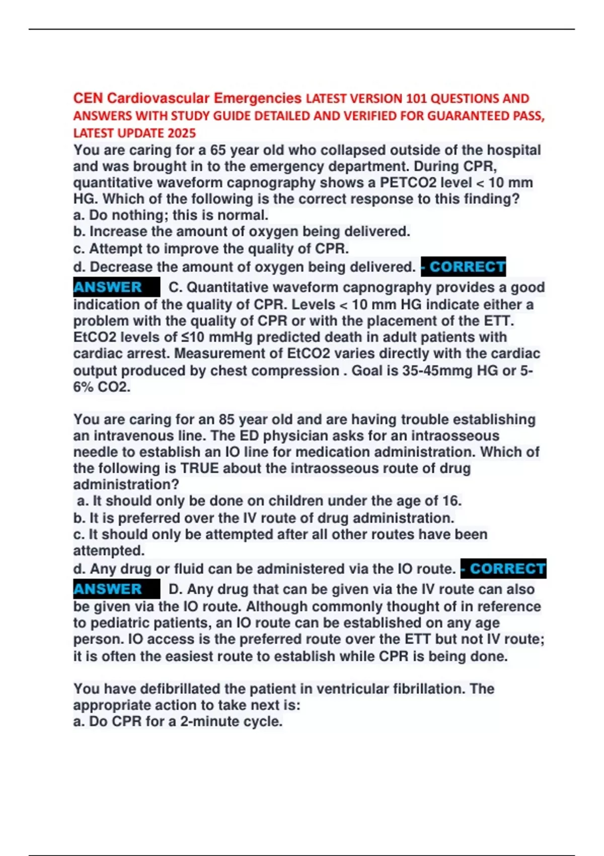 CEN Cardiovascular Emergencies LATEST VERSION 101 QUESTIONS AND ANSWERS WITH STUDY GUIDE DETAILED AND VERIFIED FOR GUARANTEED PASS, LATEST UPDATE 2025