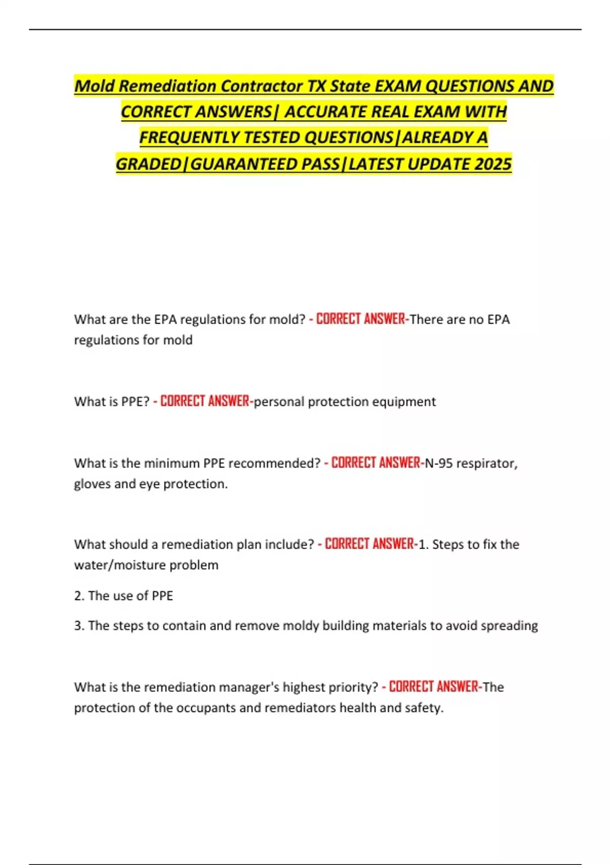 Mold Remediation Contractor TX State EXAM QUESTIONS AND CORRECT ANSWERS| ACCURATE REAL EXAM WITH FREQUENTLY TESTED QUESTIONS|ALREADY A GRADED|GUARANTEED PASS|LATEST UPDATE 2025