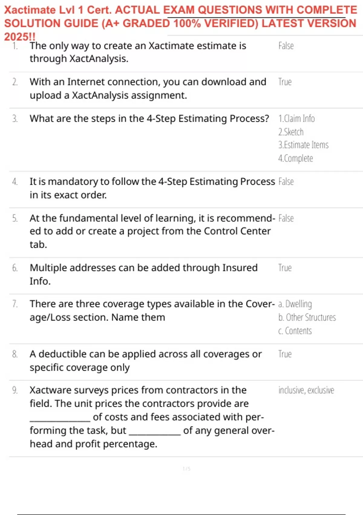 Xactimate Lvl 1 Cert. ACTUAL EXAM QUESTIONS WITH COMPLETE SOLUTION GUIDE (A+ GRADED 100% VERIFIED) LATEST VERSION 2025!!