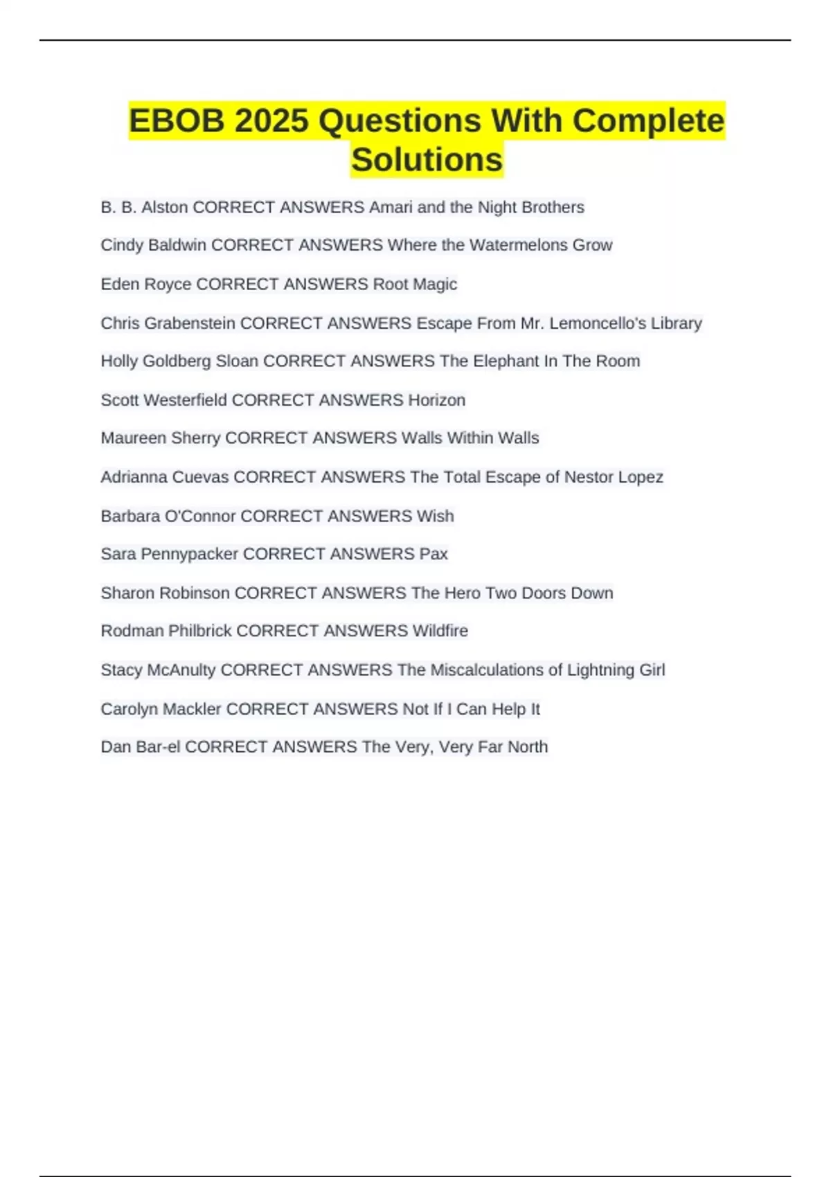 Chris Grabenstein CORRECT ANSWERS Escape From Mr. Lemoncello's Library