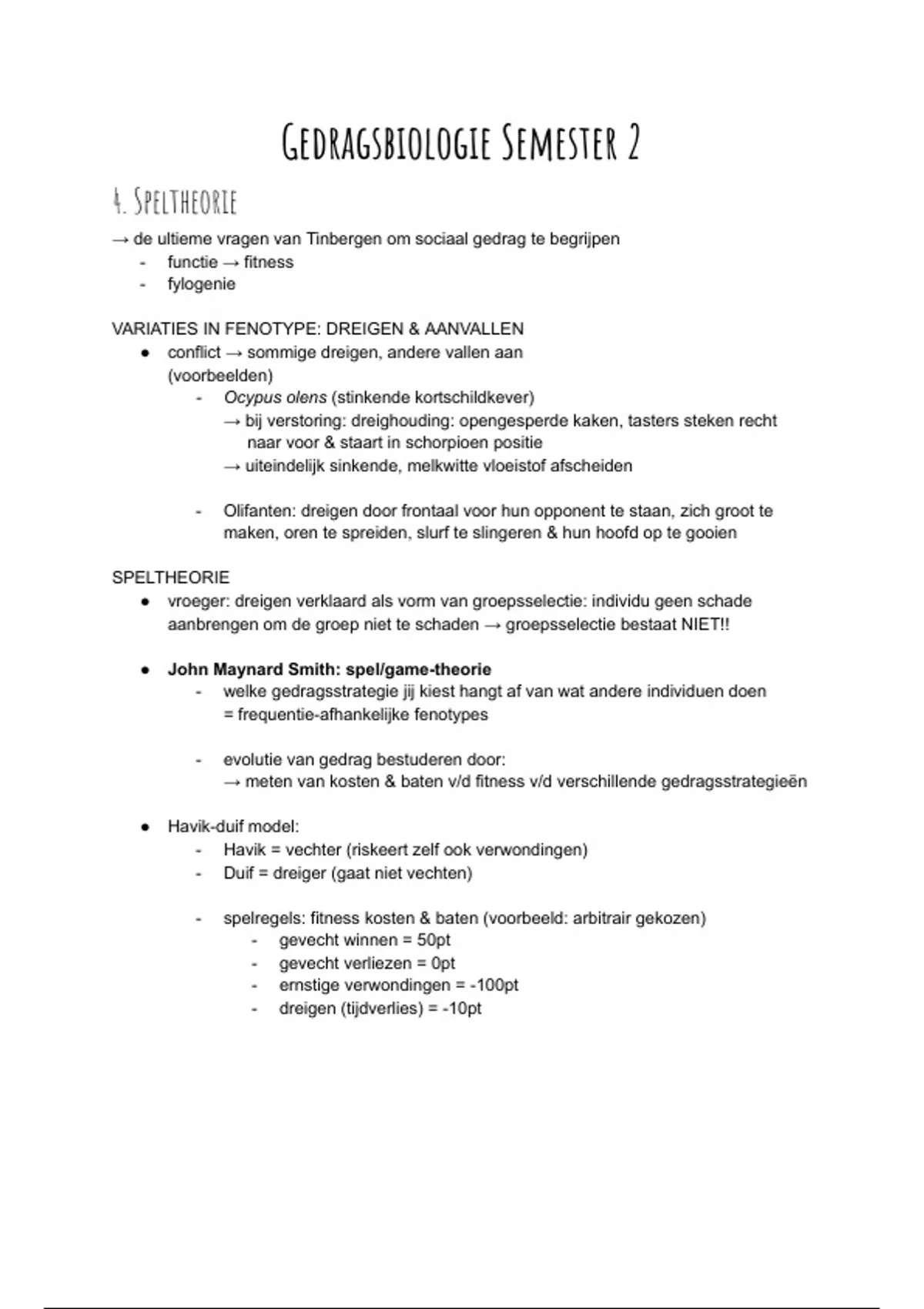 Deze uitgebreide samenvatting behandelt de volledige collegestof van het vak Gedragsbiologie voor semester 2. Onderwerpen zoals speltheorie, sociaal gedrag, reproductief altruïsme, vrouwelijke seksuele competitie en coöperatie worden grondig uitgelegd. Inclusief theorieën van Tinbergen, John Maynard Smith, Trivers, Hamilton en Sarah Hrdy, aangevuld met biologische voorbeelden en evolutionaire modellen. Ideaal als voorbereiding op examens of herhaling van complexe gedragsbiologische concepten. Gebaseerd op de cursus en slides