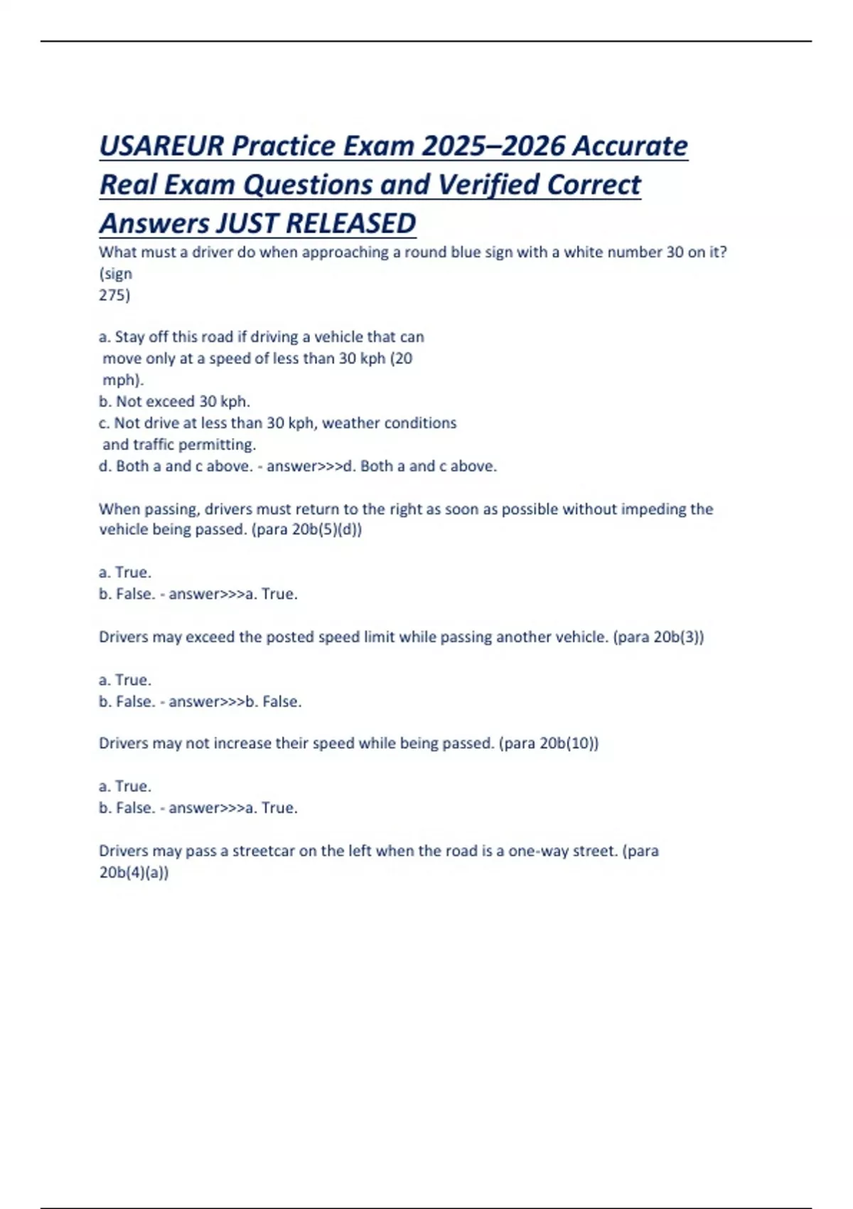 This document contains the complete set of real exam questions with verified correct answers for the USAREUR (United States Army Europe) Practice Exam for the 2025–2026 cycle. It covers essential topics such as European traffic regulations, road signs and markings, vehicle safety requirements, command policies, SOFA (Status of Forces Agreement) rules, and practical driving scenarios. Ideal for U.S. military personnel, dependents, and civilian employees preparing for their USAREUR driver’s license exam.