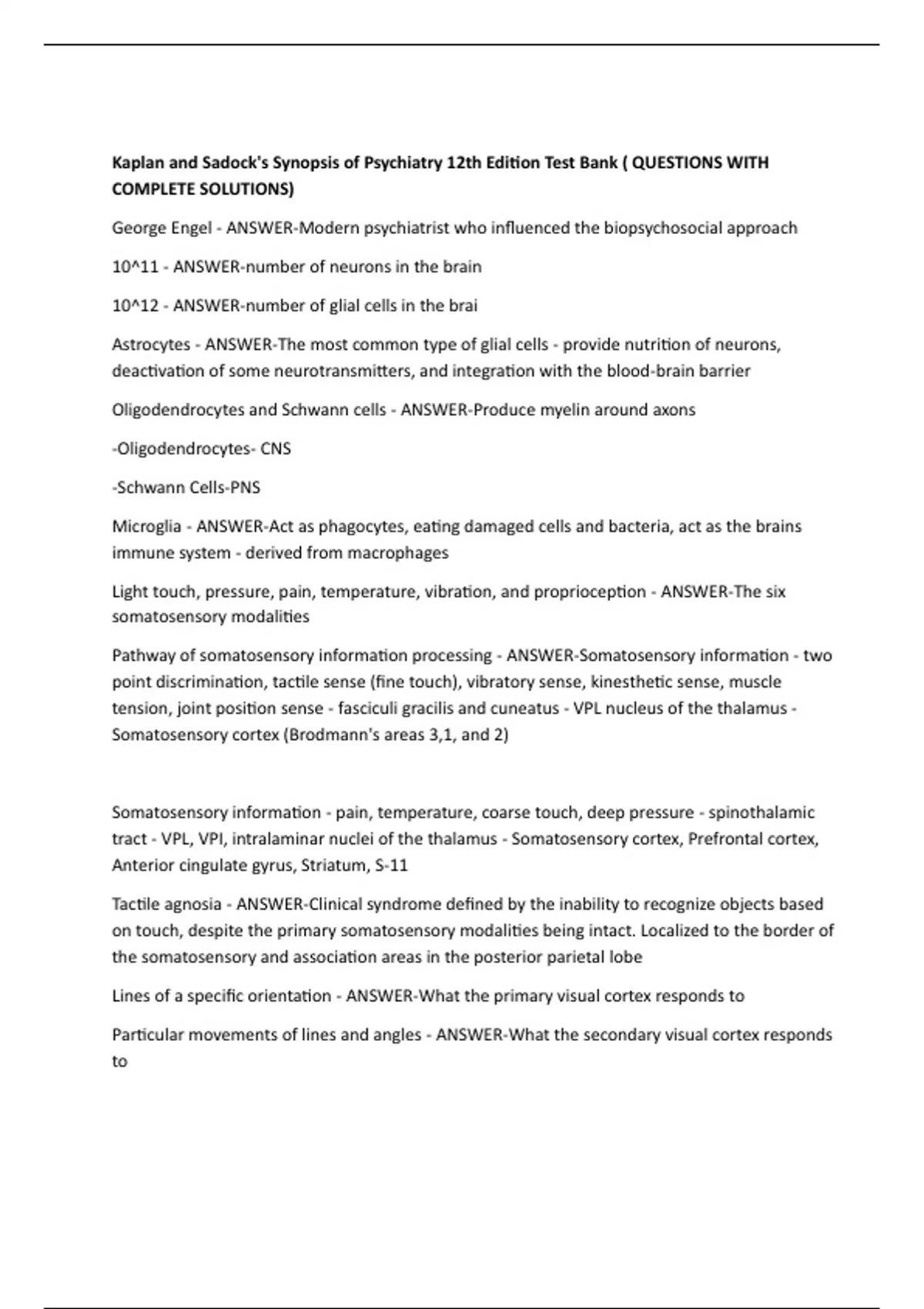 Kaplan and Sadock's Synopsis of Psychiatry 12th Edition Test Bank ( QUESTIONS WITH COMPLETE SOLUTIONS)