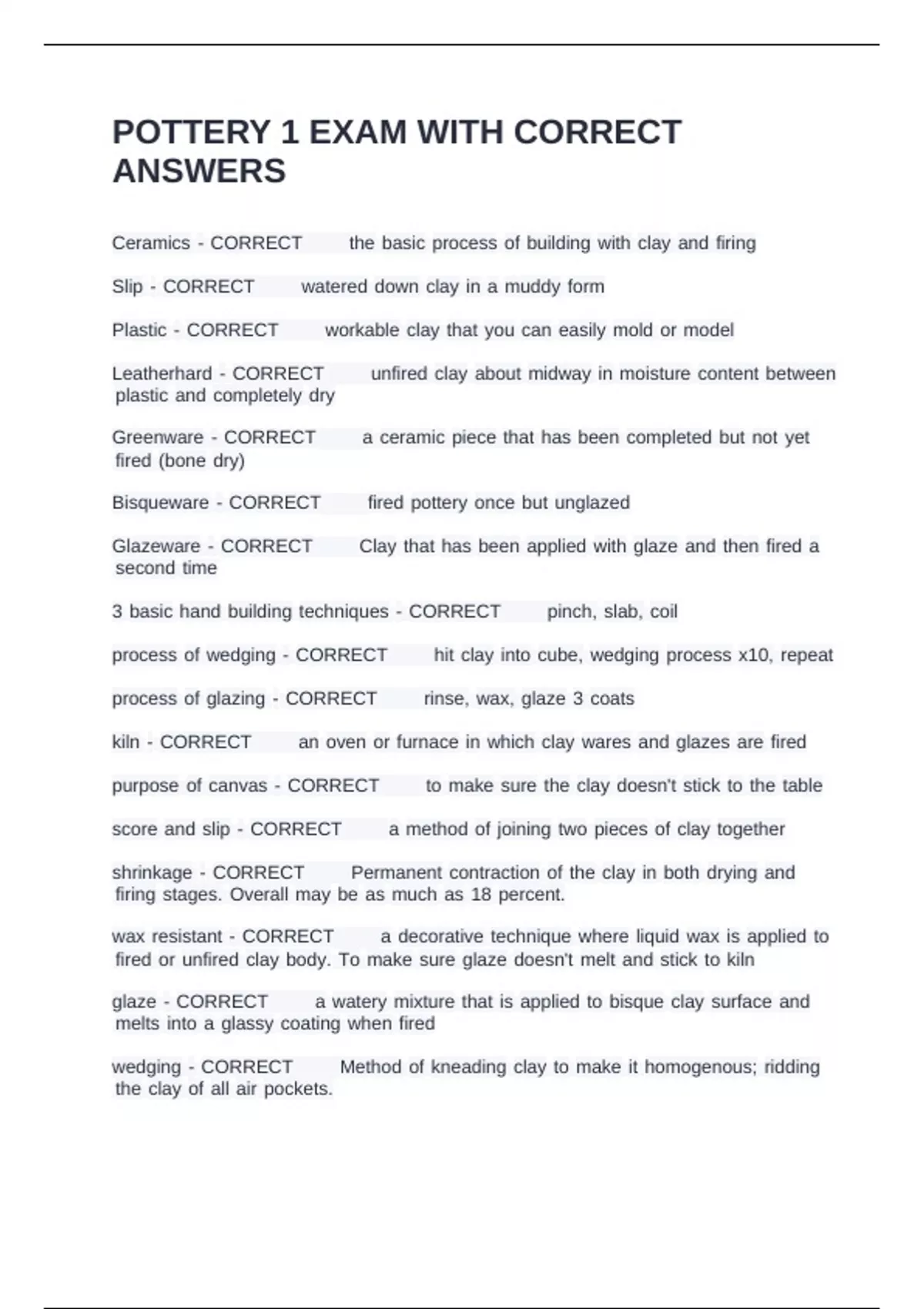 POTTERY 1 EXAM WITH CORRECT
