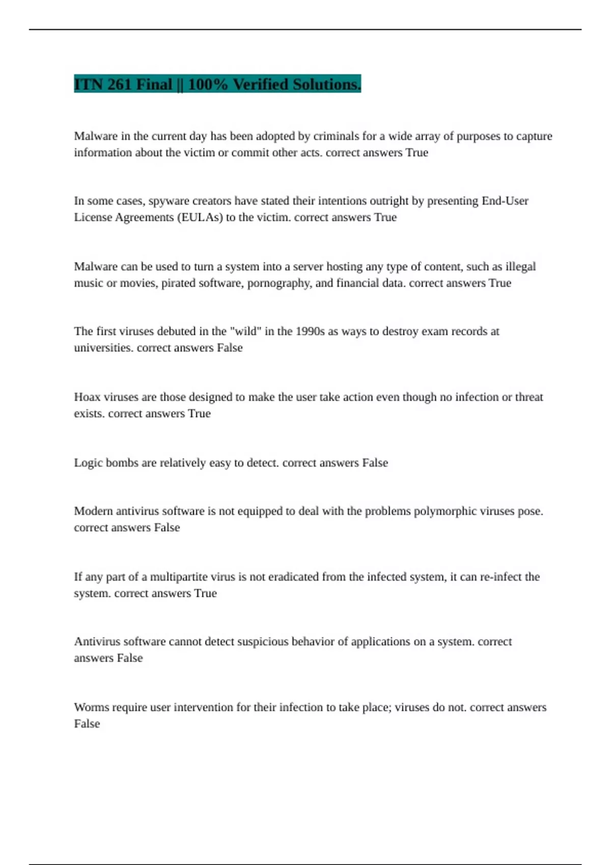 Malware in the current day has been adopted by criminals for a wide array of purposes to capture information about the victim or commit other acts. correct answers True In some cases, spyware creators have stated their intentions outright by presenting End-User License Agreements (EULAs) to the victim. correct answers True Malware can be used to turn a system into a server hosting any type of content, such as illegal music or movies, pirated software, pornography, and financial data. correct answers True The first viruses debuted in the "wild" in the 1990s as ways to destroy exam records at universities. correct answers False Hoax viruses are those designed to make the user take action even though no infection or threat exists. correct answers True Logic bombs are relatively easy to detect. correct answers False Modern antivirus software is not equipped to deal with the problems polymorphic viruses pose. correct answers False If any part of a multipartite virus is not eradicated from the infected system, it can re-infect the system. correct answers True Antivirus software cannot detect suspicious behavior of applications on a system. correct answers False Worms require user intervention for their infection to take place; viruses do not. correct answers False
