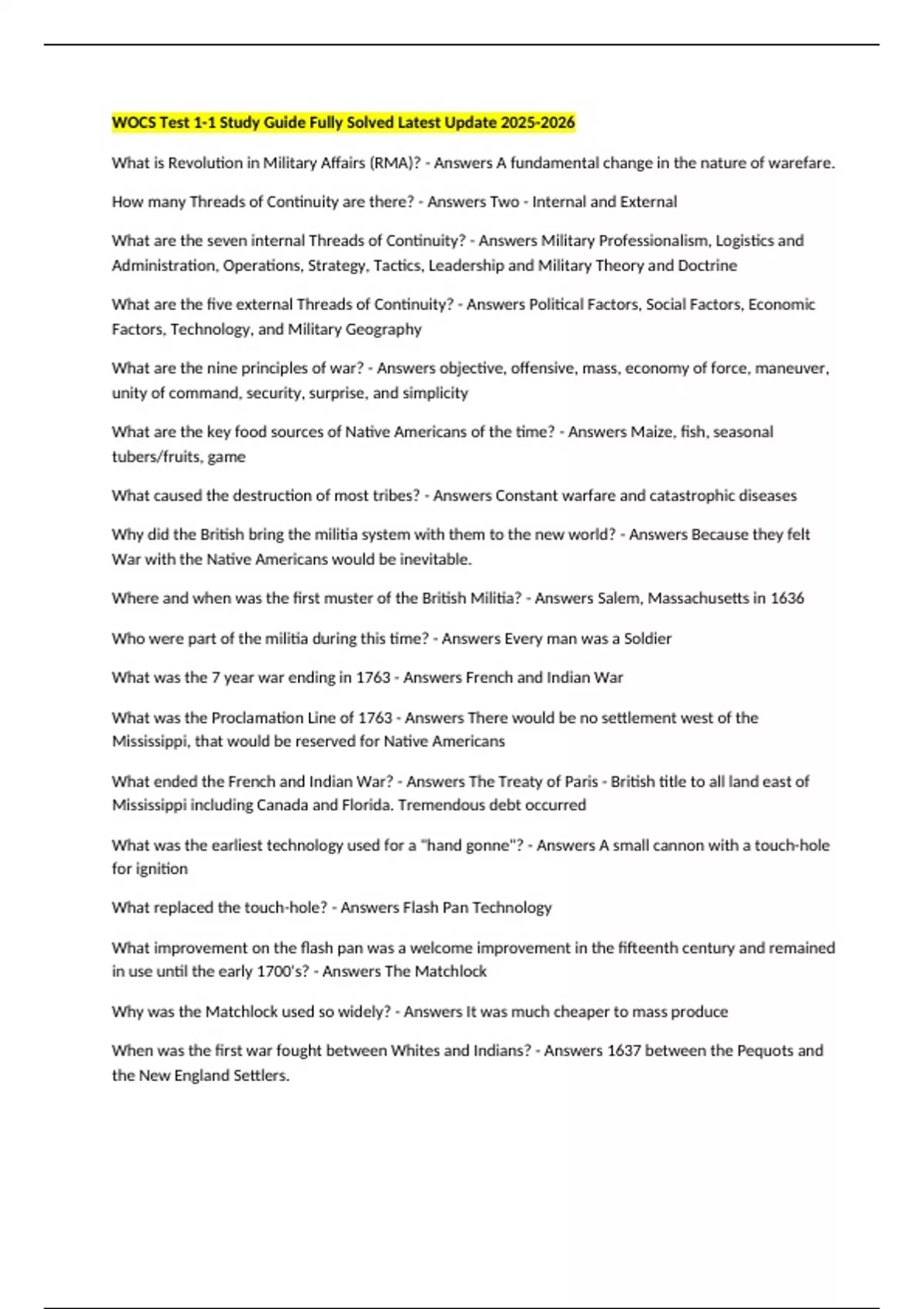 WOCS Test 1-1 Study Guide Fully Solved Latest Update What is Revolution in Military Affairs (RMA)? - Answers A fundamental change in the nature of warefare. How many Threads of Continuity are there? - Answers Two - Internal and External What are the seven internal Threads of Continuity? - Answers Military Professionalism, Logistics and Administration, Operations, Strategy, Tactics, Leadership and Military Theory and Doctrine What are the five external Threads of Continuity? - Answers Political Factors, Social Factors, Economic Factors, Technology, and Military Geography What are the nine principles of war? - Answers objective, offensive, mass, economy of force, maneuver, unity of command, security, surprise, and simplicity What are the key food sources of Native Americans of the time? - Answers Maize, fish, seasonal tubers/fruits, game What caused the destruction of most tribes? - Answers Constant warfare and catastrophic diseases Why did the British bring the militia system with them to the new world? - Answers Because they felt War with the Native Americans would be inevitable. Where and when was the first muster of the British Militia? - Answers Salem, Massachusetts in 1636 Who were part of the militia during this time? - Answers Every man was a Soldier What was the 7 year war ending in 1763 - Answers French and Indian War What was the Proclamation Line of 1763 - Answers There would be no settlement west of the Mississippi, that would be reserved for Native Americans What ended the French and Indian War? - Answers The Treaty of Paris - British title to all land east of Mississippi including Canada and Florida. Tremendous debt occurred What was the earliest technology used for a "hand gonne"? - Answers A small cannon with a touch-hole for ignition What replaced the touch-hole? - Answers Flash Pan Technology What improvement on the flash pan was a welcome improvement in the fifteenth century and remained in use until the early 1700's? - Answers The Matchlock Why was the Matchlock used so widely? - Answers It was much cheaper to mass produce When was the first war fought between Whites and Indians? - Answers 1637 between the Pequots and the New England Settlers. What sparked the war fought between the first war fought between the White and the Indians? - Answers The Pequots murdered a trader named John Oldham on 20 Jul 1636 Where did the first battle of the war take place? - Answers New Englanders attacked the Pequot stronghold near present-day New Haven, Conn. What did the Treaty of Paris give the British? - Answers Title to all land east of the Mississippi, including Canada and Florida What did the French and Indian War show the American Colonists? - Answers How powerful the British Army and Navy could be. It also showed them how vulnerable these same troops could be to guerrilla tactics uses by the French and Native Americans. In a Royal Proclamation issued, what were four new territories organized? - Answers Quebec, East Florida, West Florida and the island of Grenada
