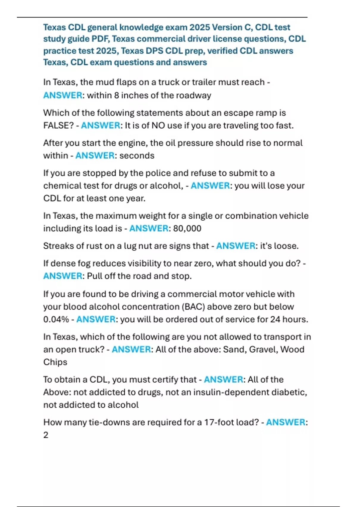 This Texas CDL General Knowledge Exam 2025 – Version C Study Guide is a comprehensive preparation resource for aspiring commercial drivers. Featuring 200+ verified practice questions with correct answers, it covers all critical areas including federal regulations, safe driving practices, vehicle inspection, hazard recognition, and transportation safety. Updated for Fall Semester 2025, this guide is perfect for Texas CDL candidates seeking to pass their General Knowledge Exam on the first attempt, ensuring mastery of core concepts and real exam readiness.