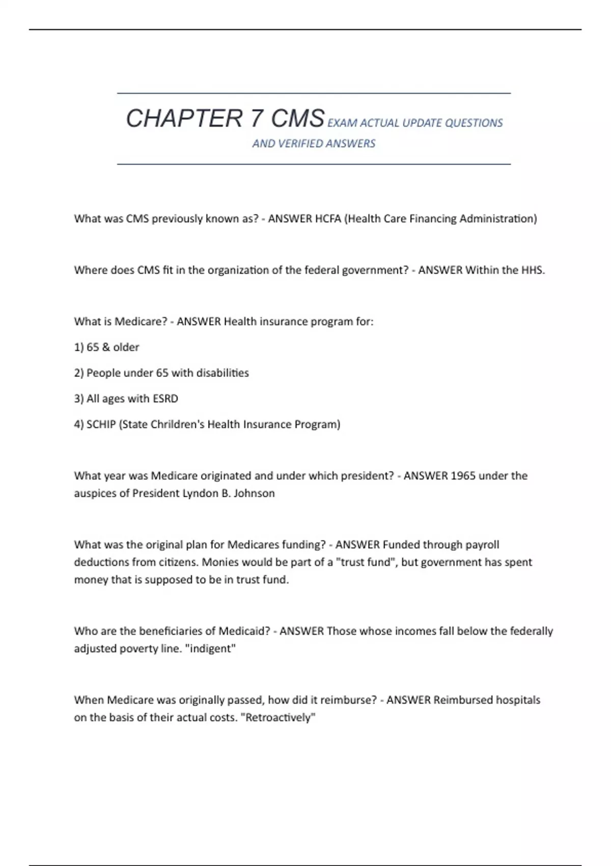 What was CMS previously known as? - ANSWER HCFA (Health Care Financing Administration)