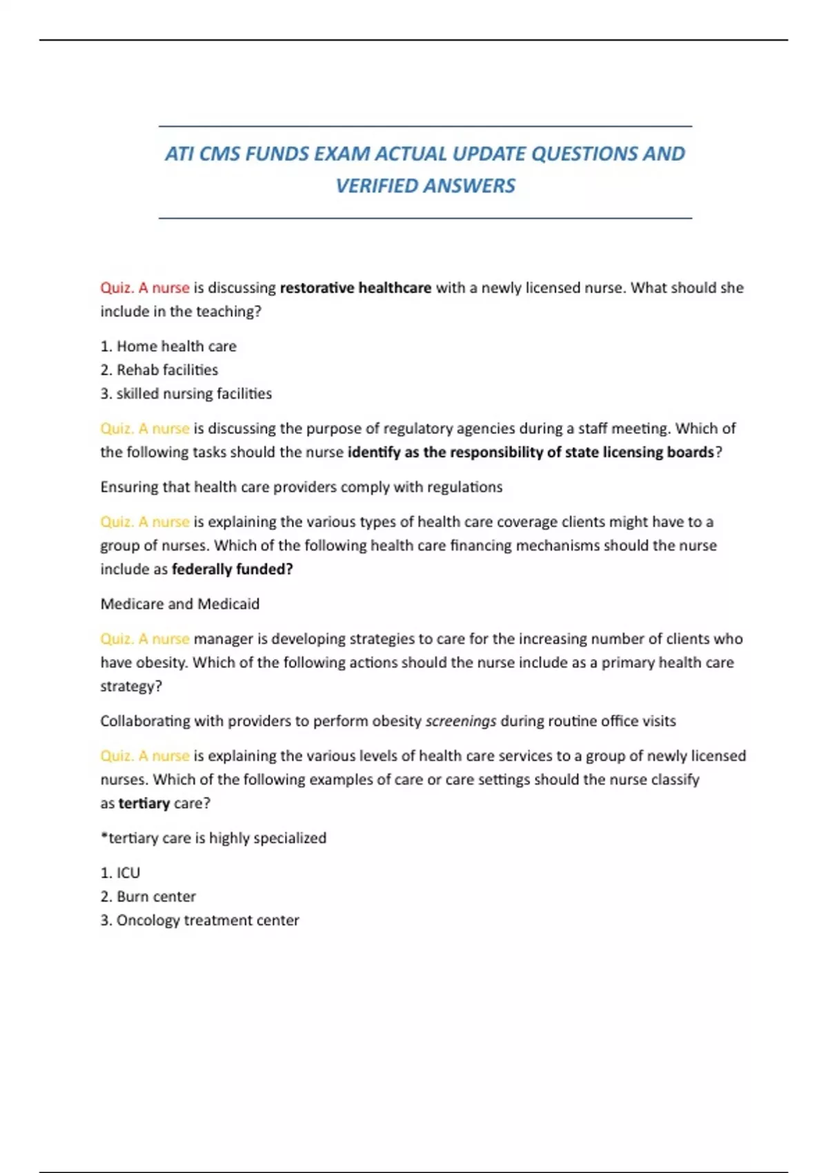 ATI CMS FUNDS EXAM ACTUAL UPDATE QUESTIONS AND