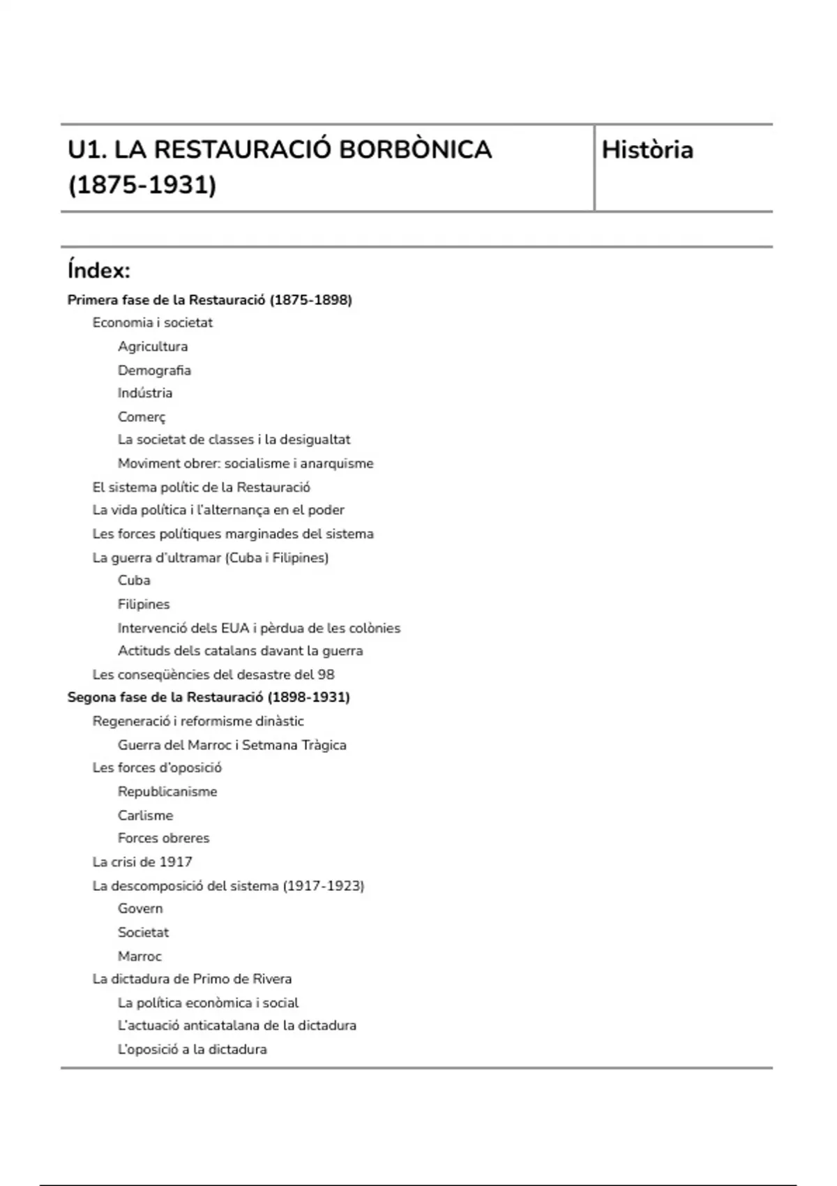U1. LA RESTAURACIÓ BORBÒNICA Història