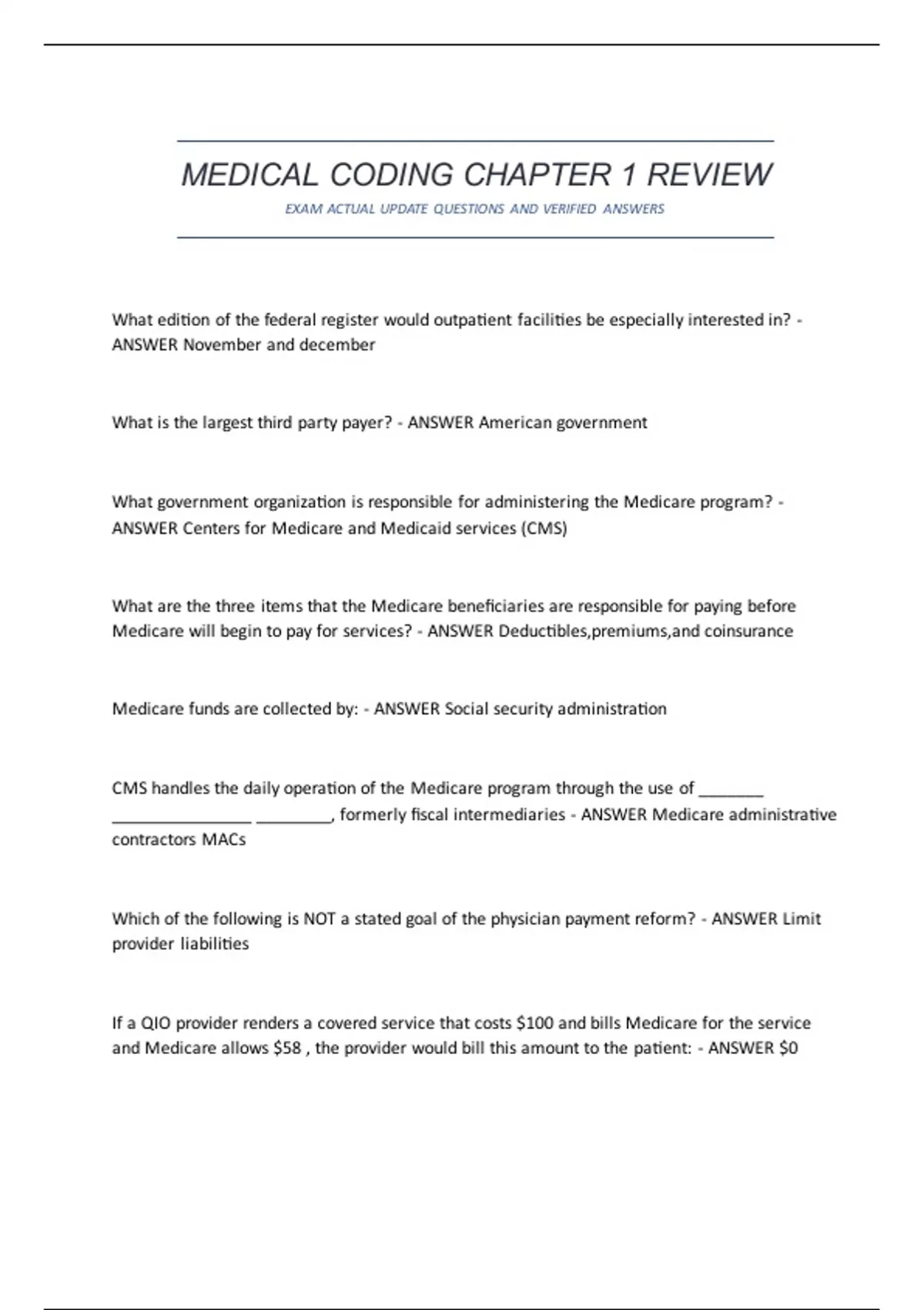 MEDICAL CODING CHAPTER 1 REVIEW EXAM ACTUAL UPDATE QUESTIONS AND VERIFIED ANSWERS