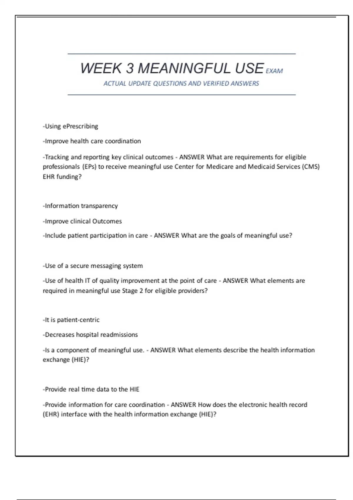 WEEK 3 MEANINGFUL USE EXAM ACTUAL UPDATE QUESTIONS AND VERIFIED ANSWERS.