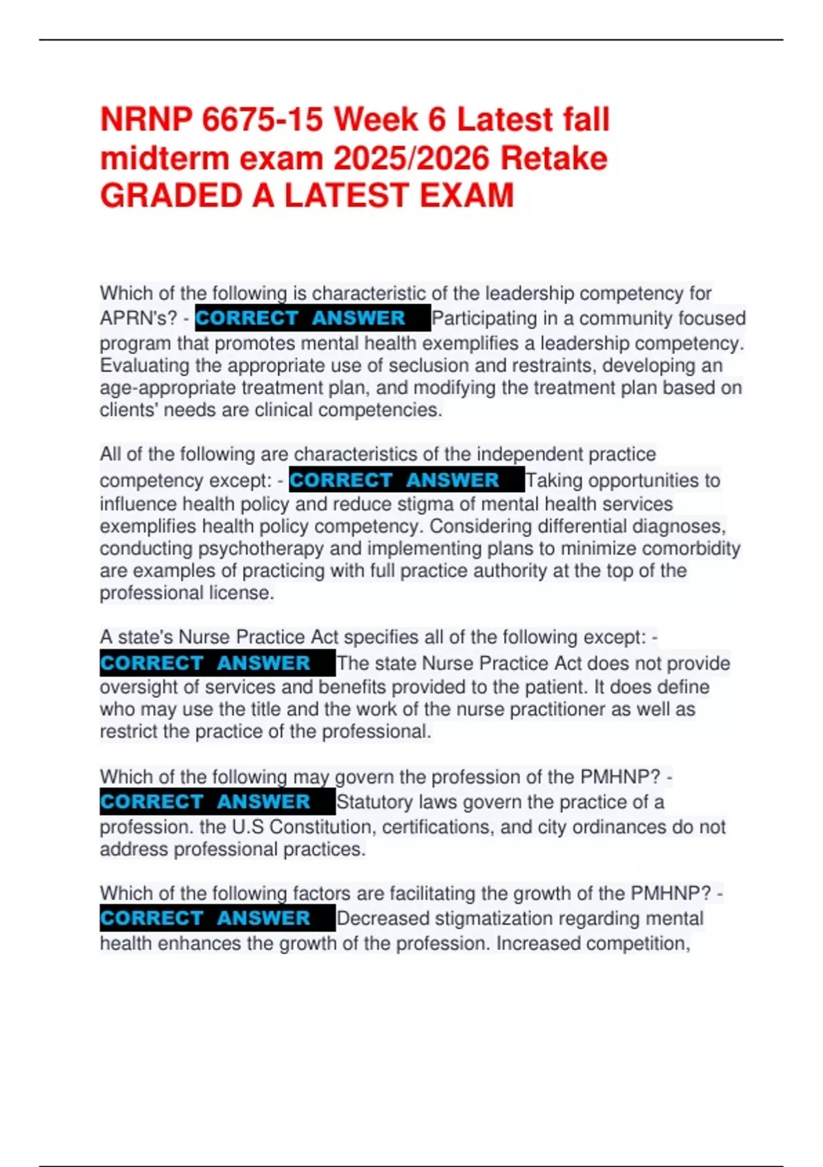 NRNP 6675-15 Week 6 Latest fall midterm exam 2025/2026 Retake GRADED A LATEST EXAM