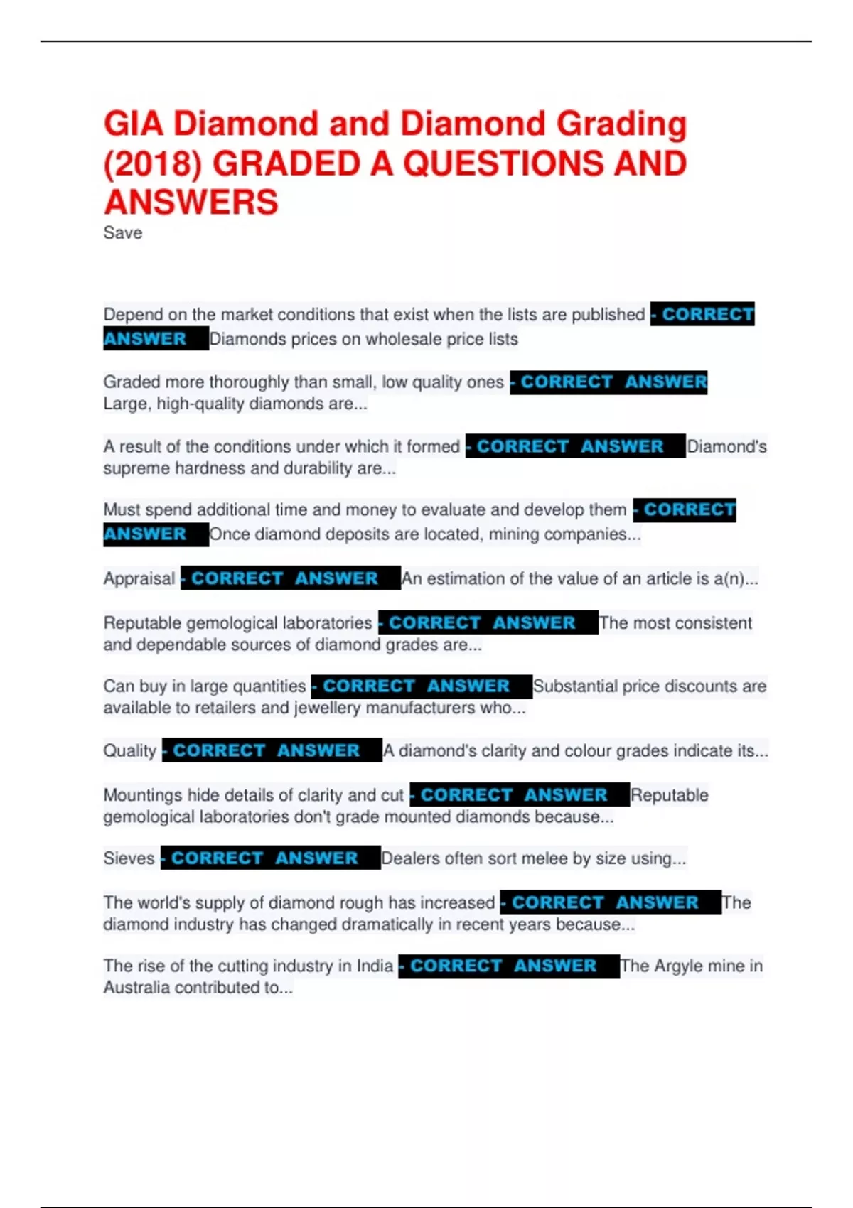 Quality - CORRECT ANSWER A diamond's clarity and colour grades indicate its...