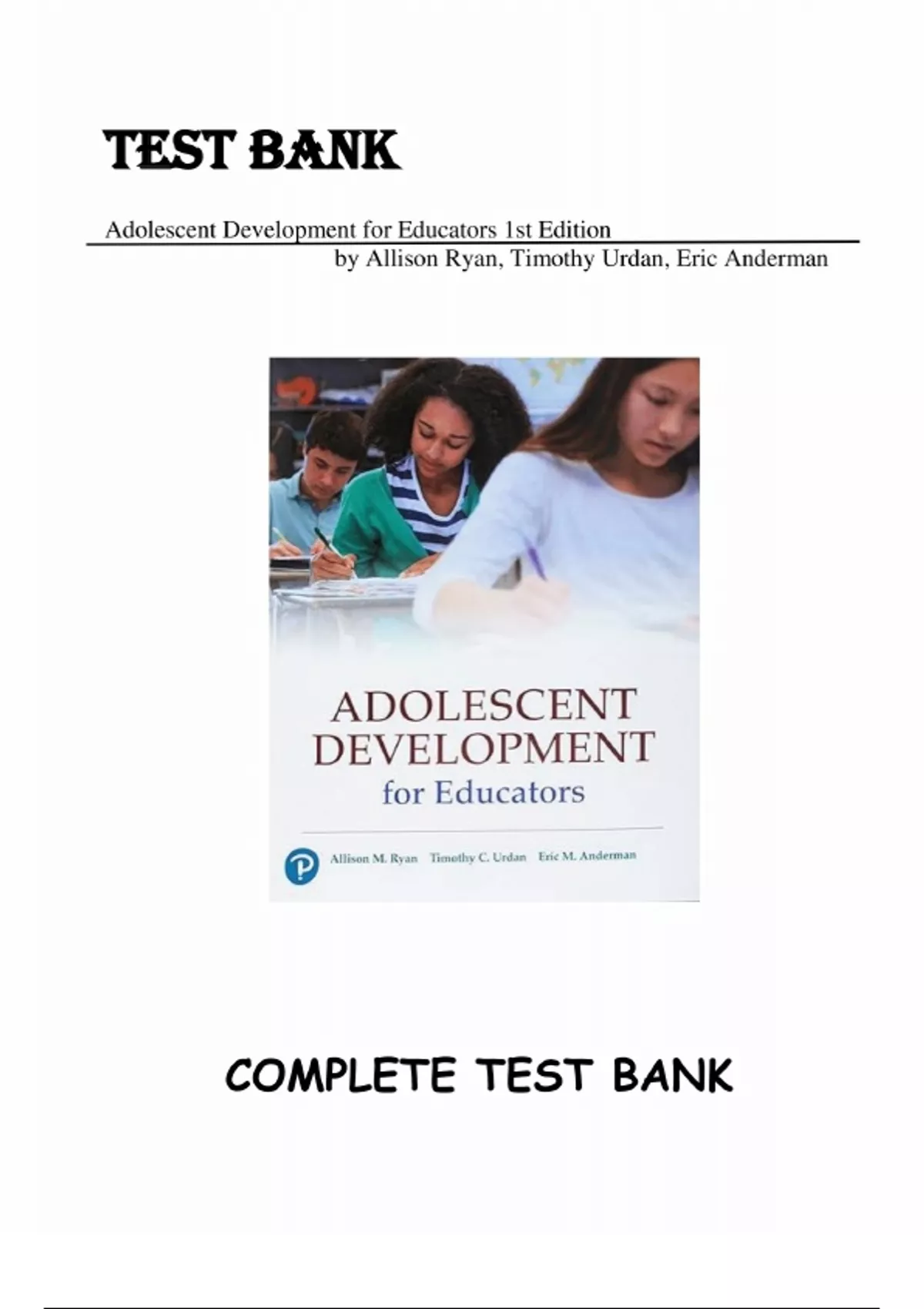 Test Bank for Adolescent Development for Educators, 1st edition by Allison M Ryan, Timothy C. Urdan, Eric M. Anderman |Chapter 1-12...... 1. Introduction to Adolescence, 2. Physical Development, 3. Cognitive and Intellectual Development, 4. Social and Moral Development, 5. Identity and Self-Perceptions, 6. Families, 7. Technology and Media, 8. Peers, 9. Motivation, Classrooms and Schools, 10. Sexuality and Romantic Relationships, 11. Mental Health, Coping Strategies, and Problems, 12. Moving into Adulthood