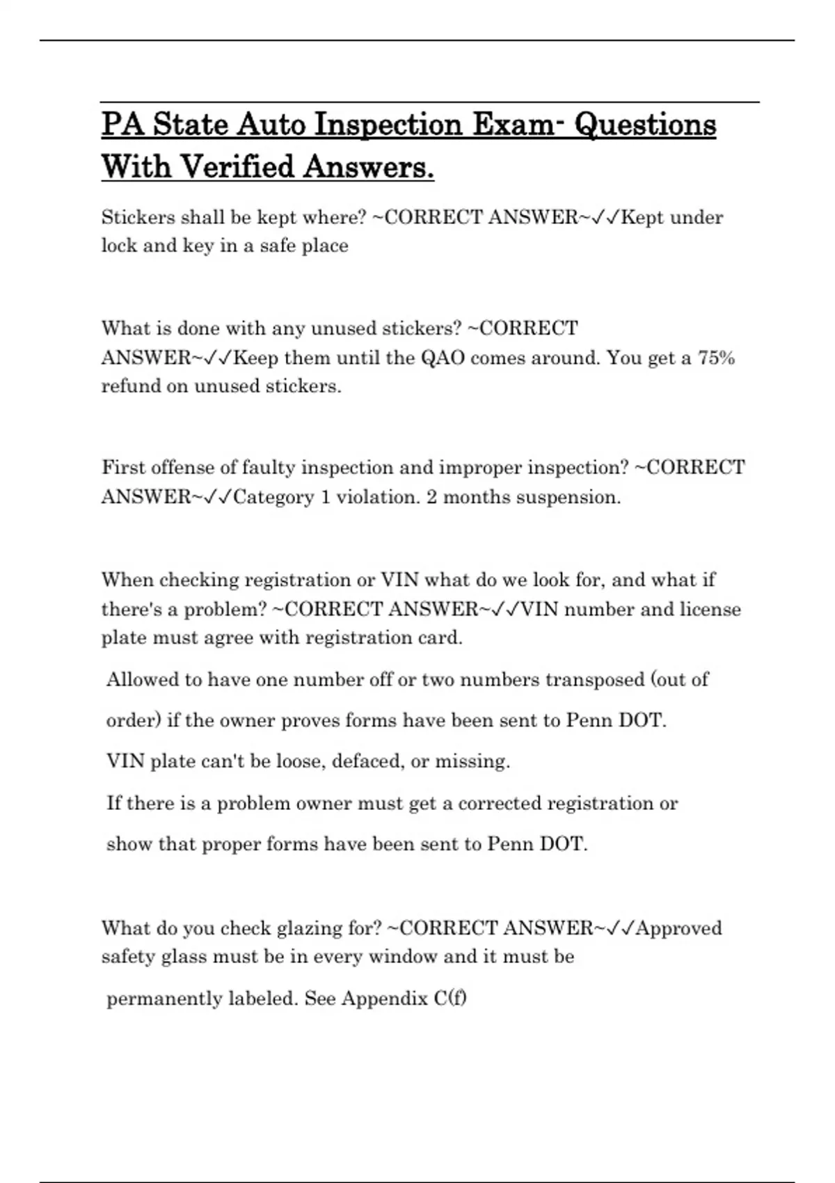 Pass your Pennsylvania State Auto Inspection License Exam with this fully verified question-and-answer guide! Includes detailed content on safety inspection procedures, suspension criteria, sticker regulations, VIN and glazing checks, brake specs, horn and wiper function, exhaust and emissions, tire tread depth, inspection station protocols, and mechanic certification rules. Perfect for automotive techs preparing for PA certification.
