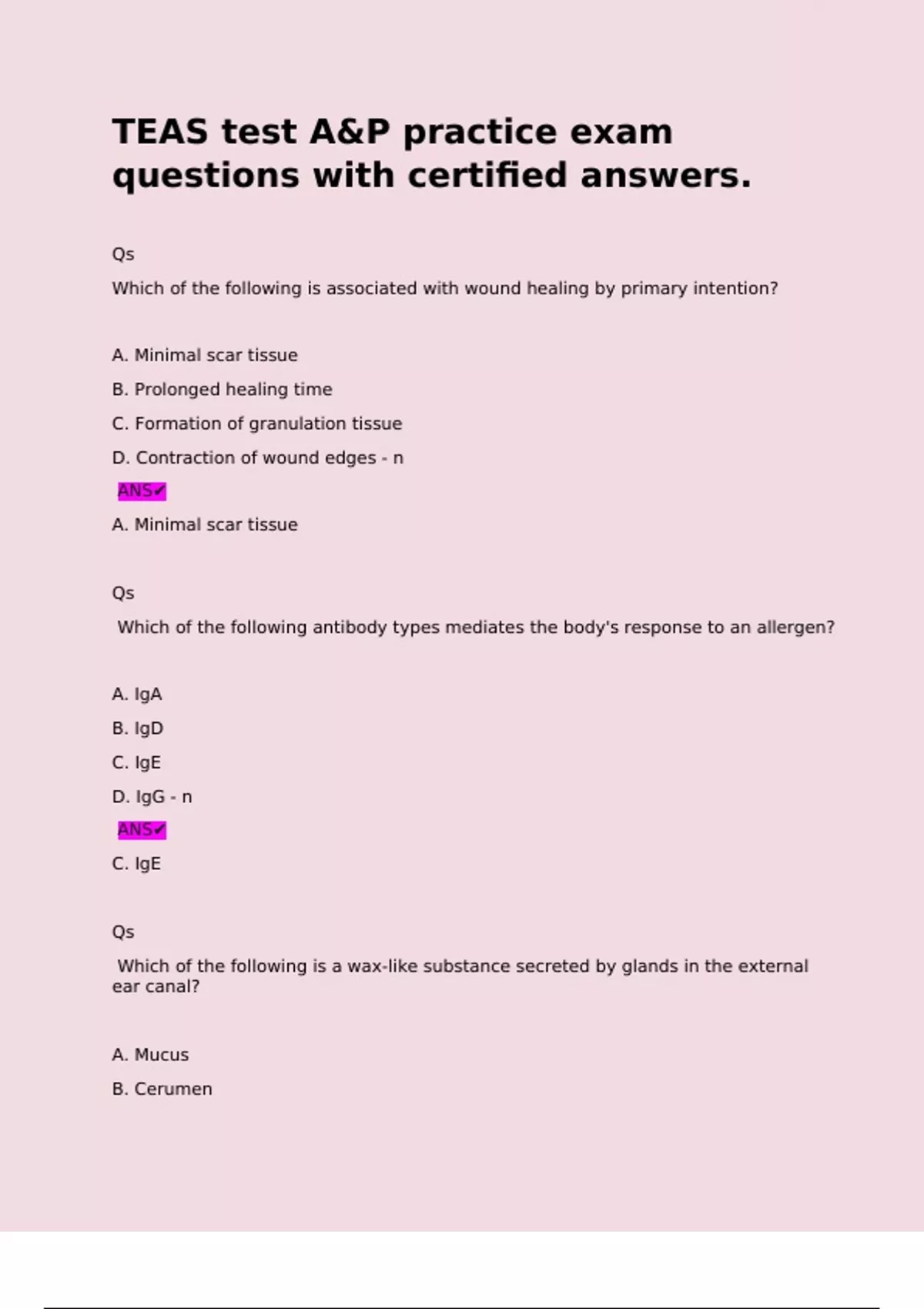 TEAS test A&P practice exam questions with certified answers. Qs Which of the following is associated with wound healing by primary intention? A. Minimal scar tissue B. Prolonged healing time C. Formation of granulation tissue D. Contraction of wound edges - n ANS A. Minimal scar tissue Qs Which of the following antibody types mediates the body's response to an allergen? A. IgA B. IgD C. IgE D. IgG - n ANS C. IgE Qs Which of the following is a wax-like substance secreted by glands in the external ear canal? A. Mucus B. Cerumen C. Sweat D. Sebum - n