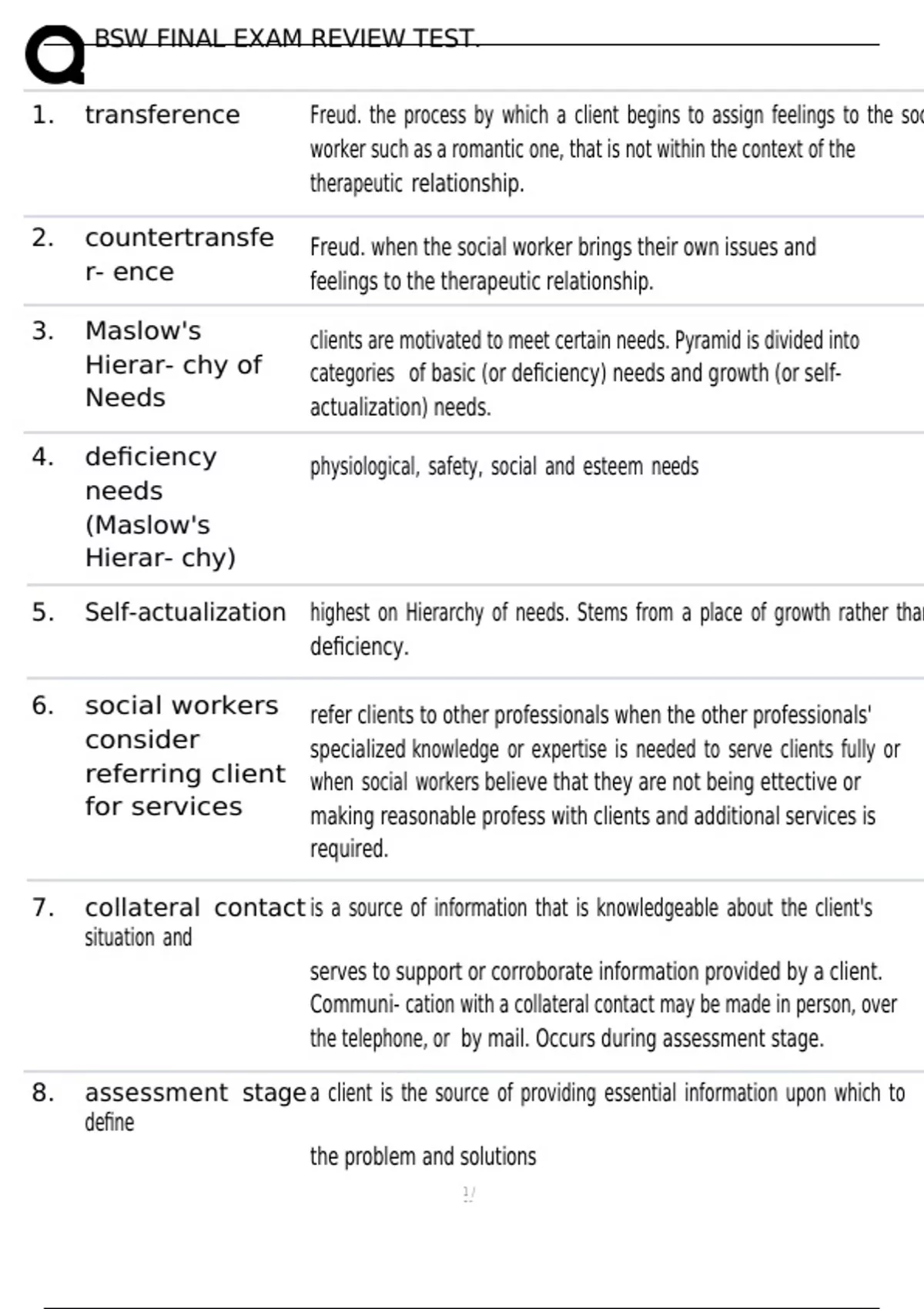 1. transference Freud. the process by which a client begins to assign feelings to the soc