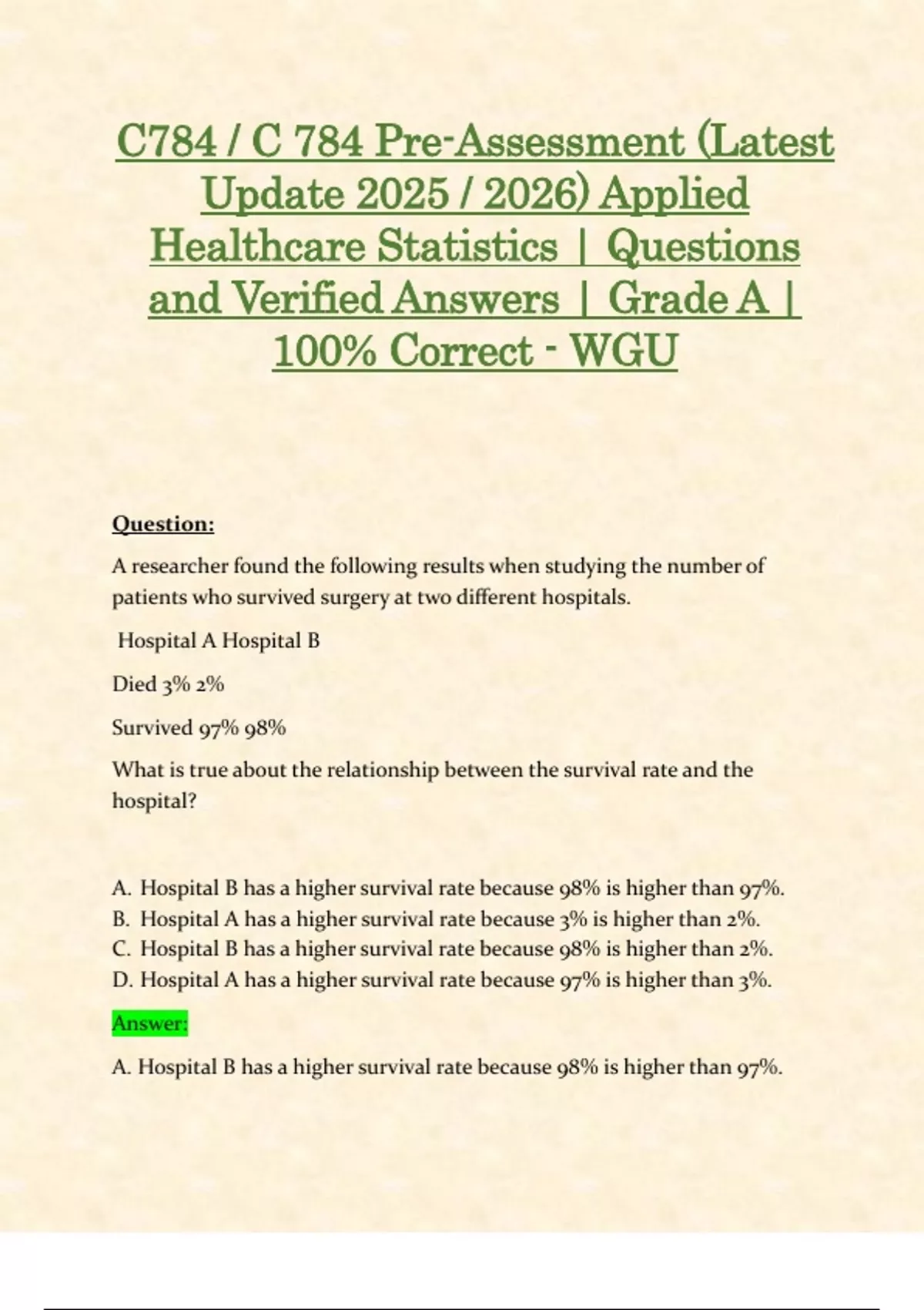 A. Hospital B has a higher survival rate because 98% is higher than 97%.