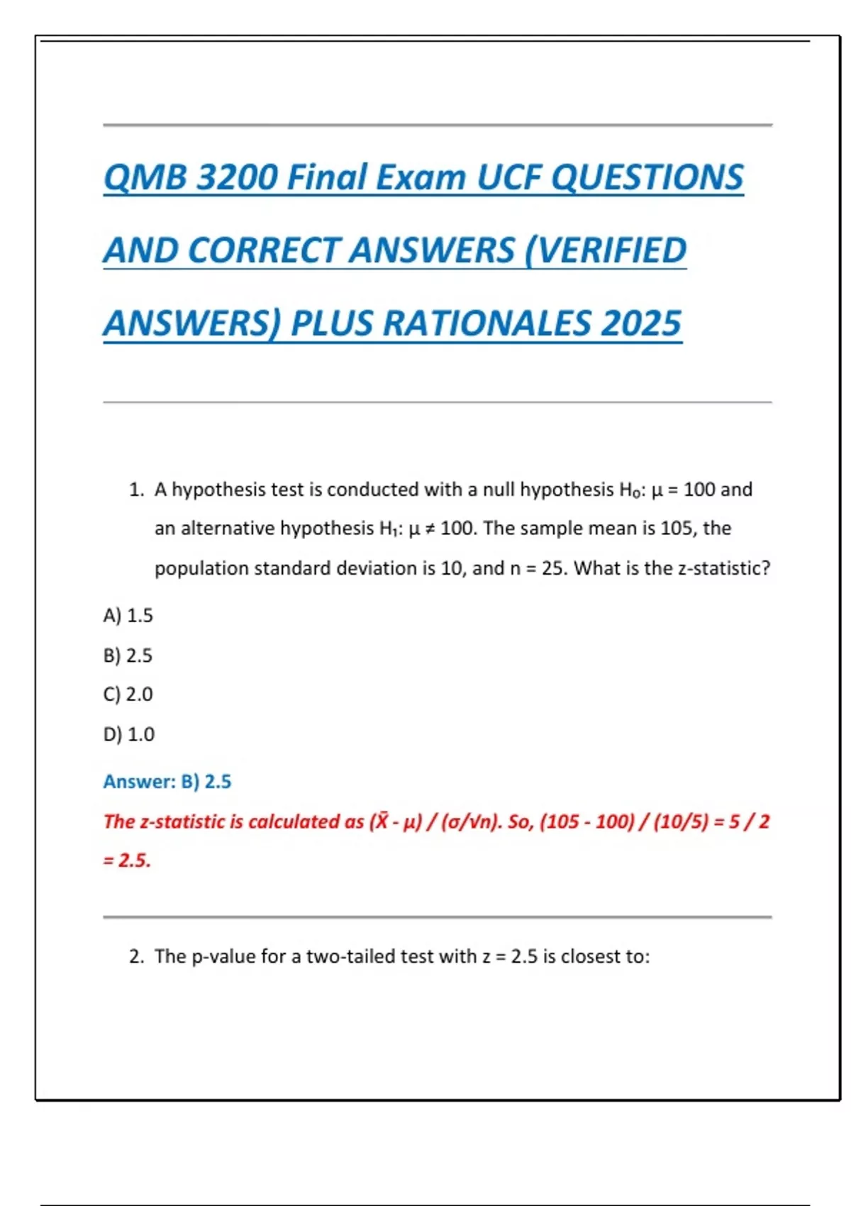 1. A hypothesis test is conducted with a null hypothesis H₀: μ = 100 and