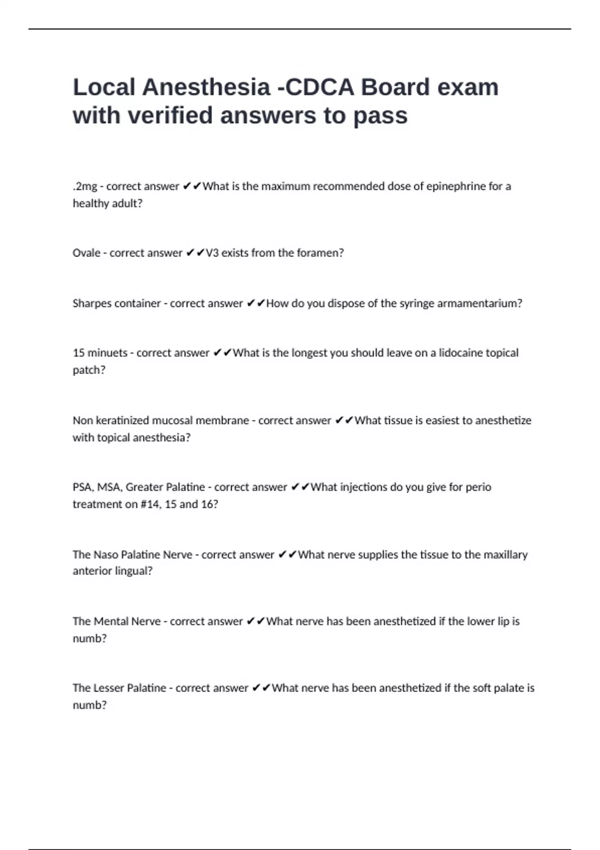 Local Anesthesia -CDCA Board exam with verified answers to pass