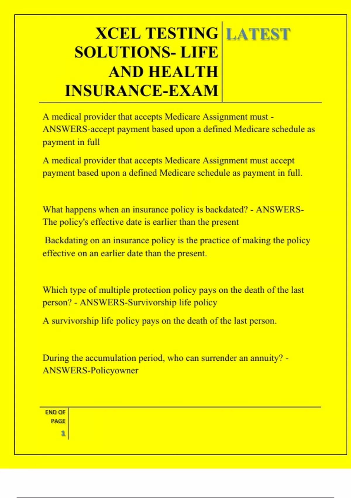 XCEL TESTING SOLUTIONS- LIFE AND HEALTH INSURANCE-EXAM QUESTIONS AND ANSWERS 2025
